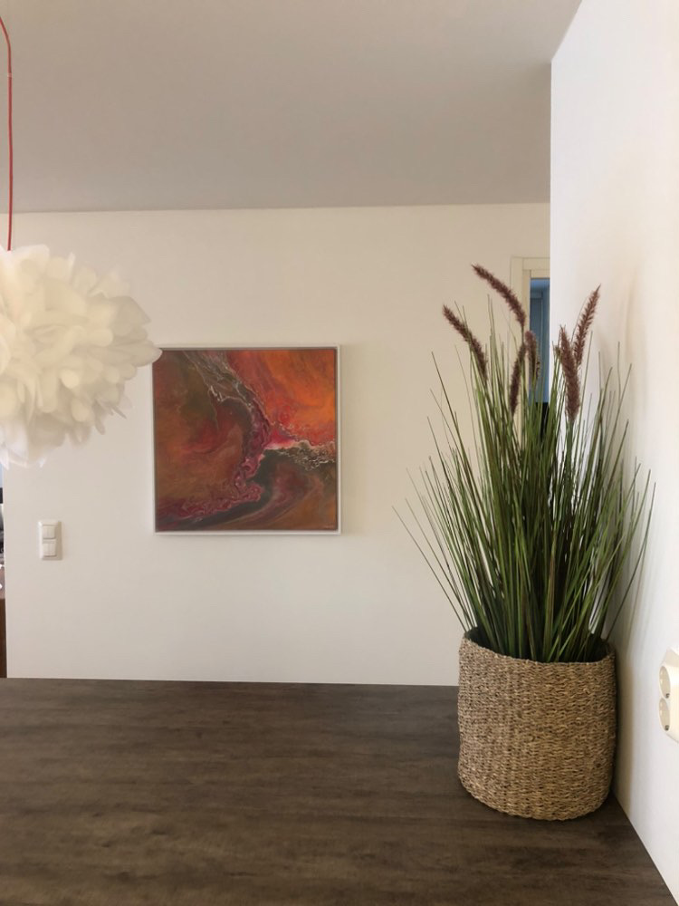 ”Paahde työ on löytänyt paikkansa kodissamme ja sopii hyvin sisustuksen värimaailmaan. Työ on kaunis ja voimaannuttava osa sisustusta. Oranssi väri ja upea kokonaisuus luovat minulle mielikuvan elämänvoimasta, sinnikkyydestä ja valoistasta tulevaisuudesta.”