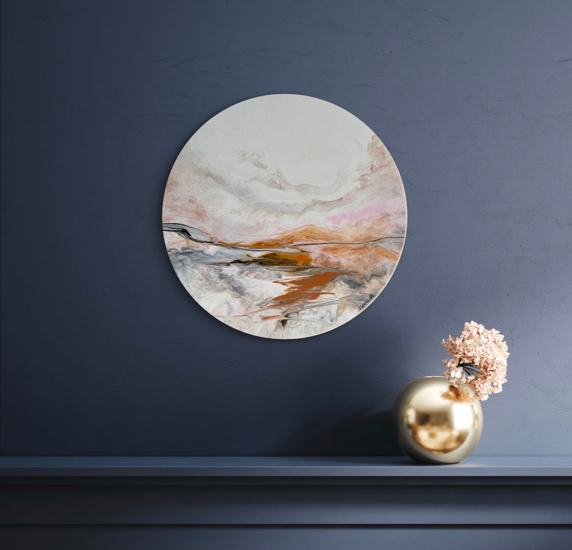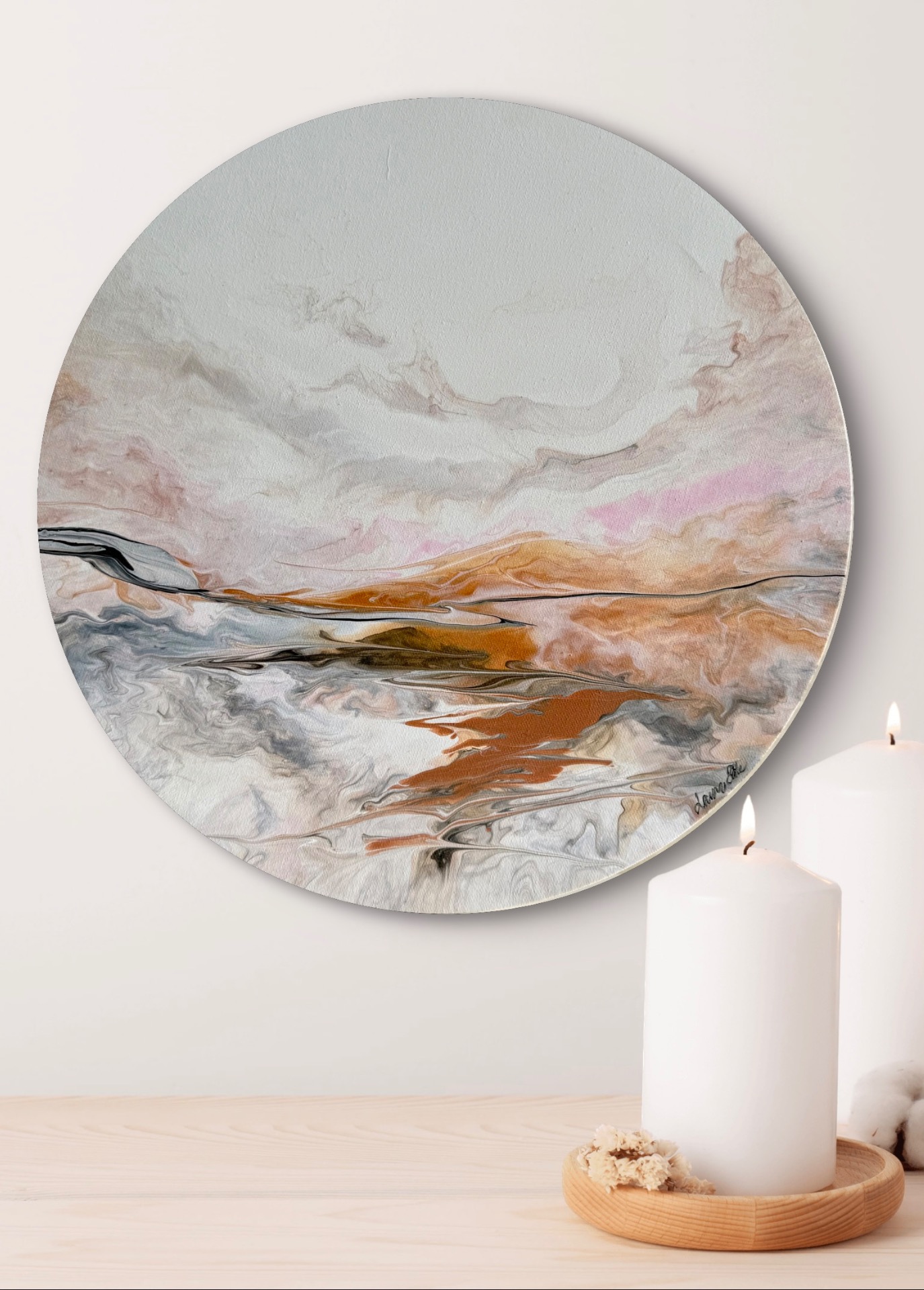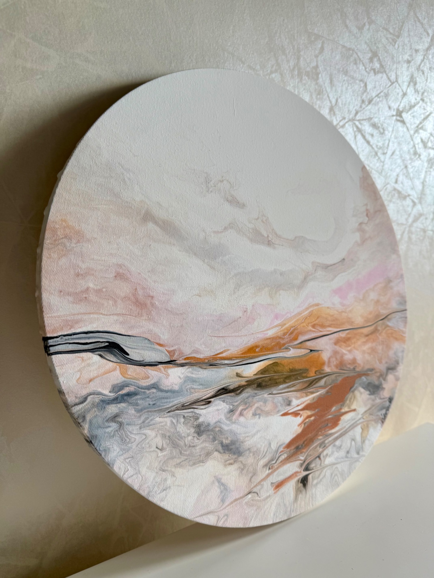 Utuisten pehmeiden maanläheisten sävyjen taivaanrantamaalaus, jossa ripaus vaaleanpunaista.