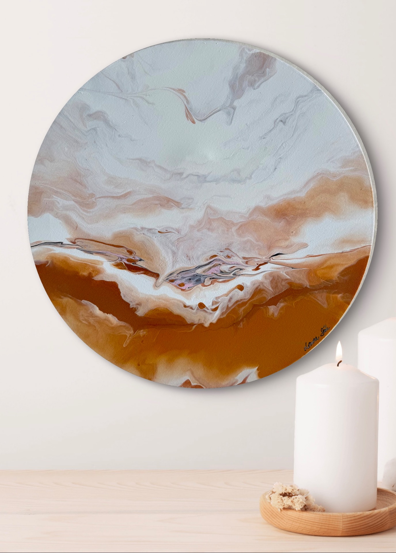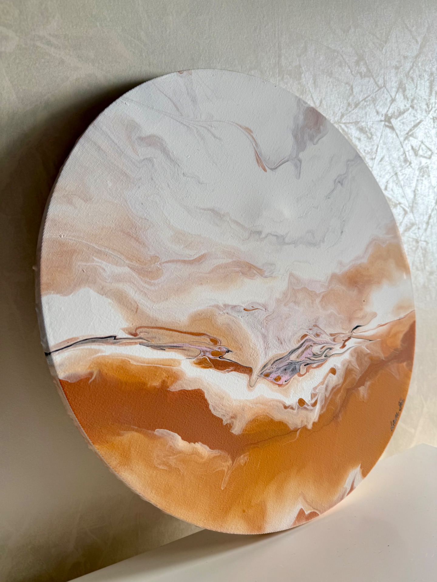 Utuisten, pehmeiden ruskeansävyjen taivaanrantamaalaus, jossa aavistus vaaleanpunaista.