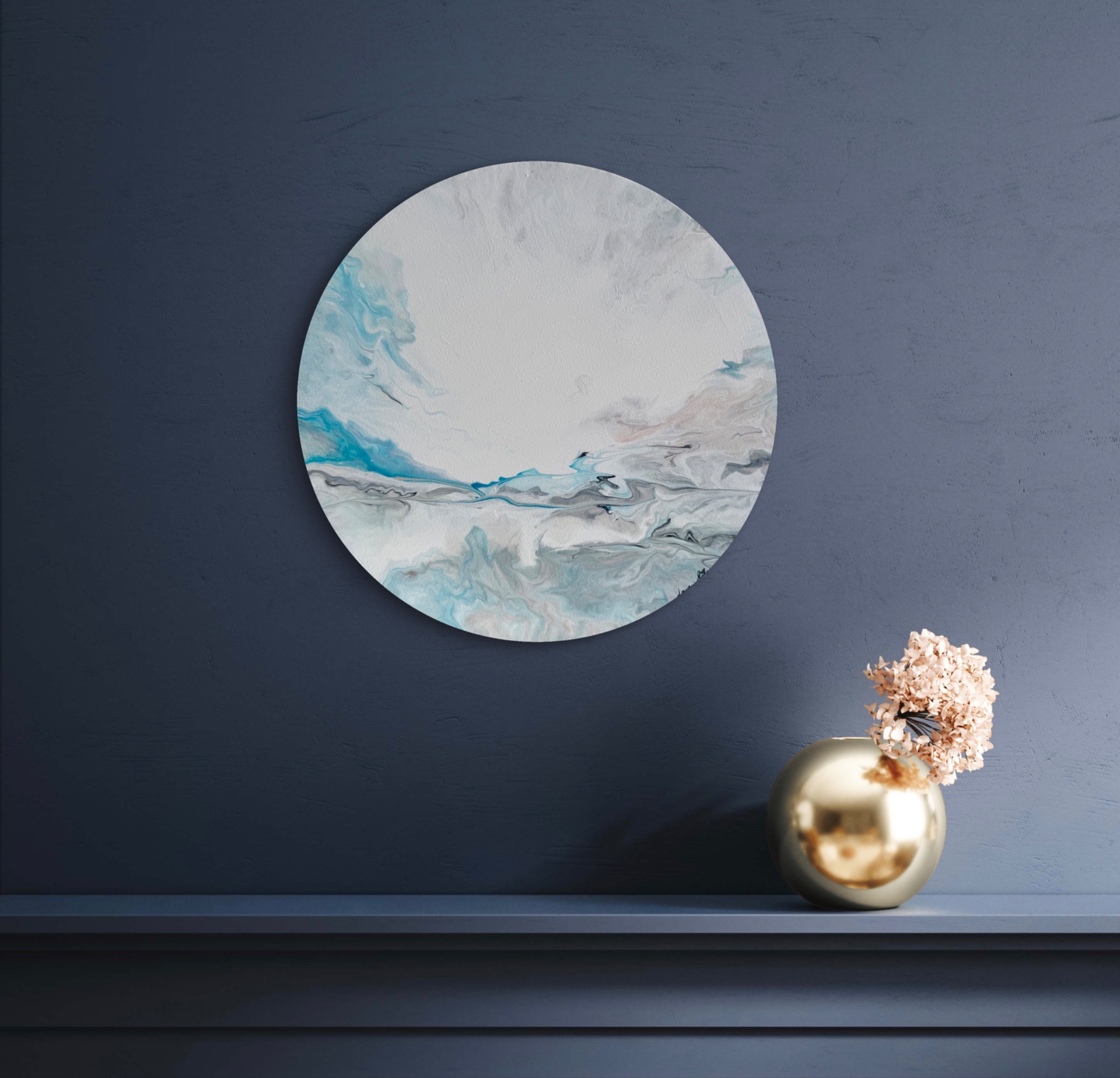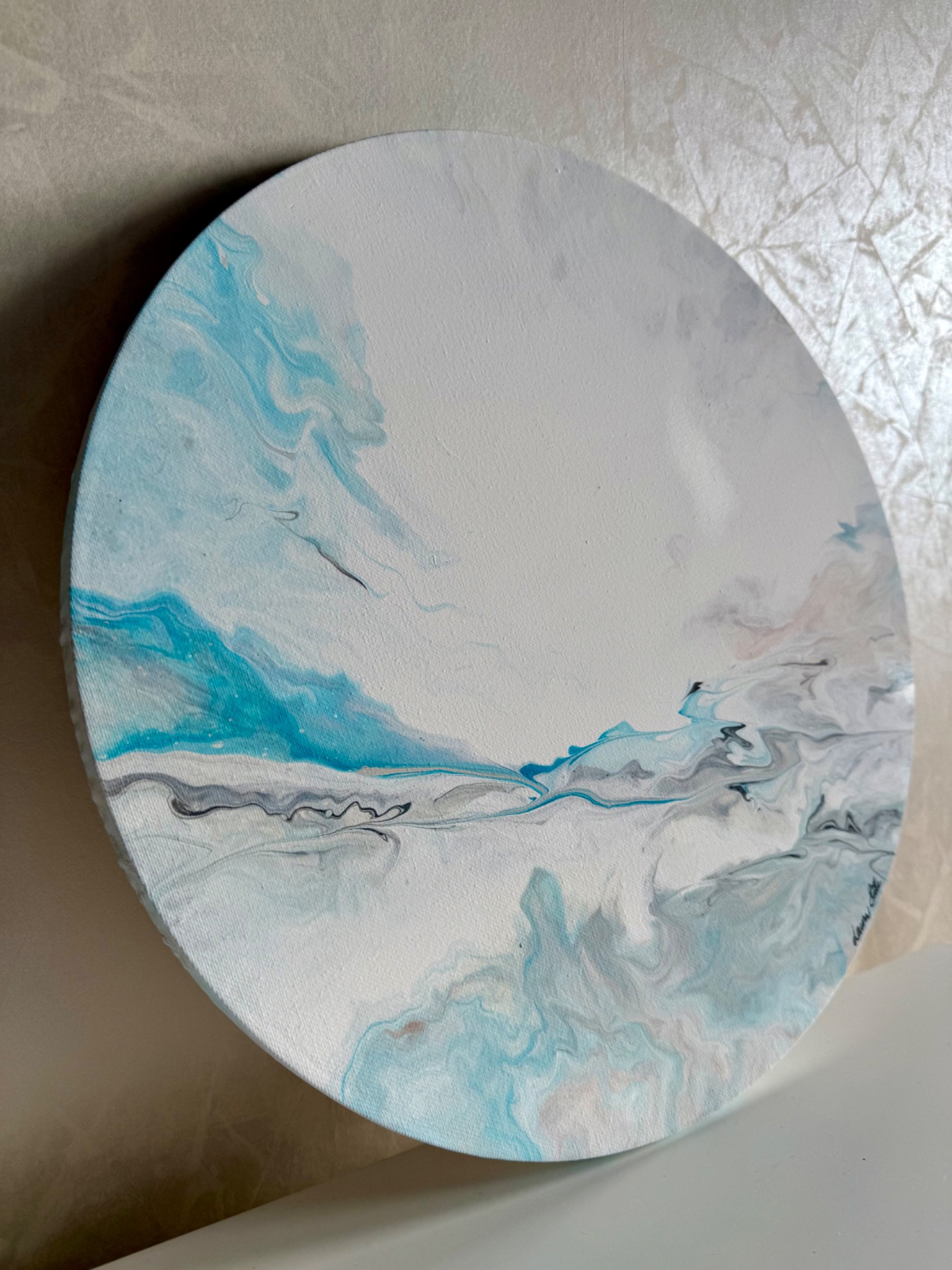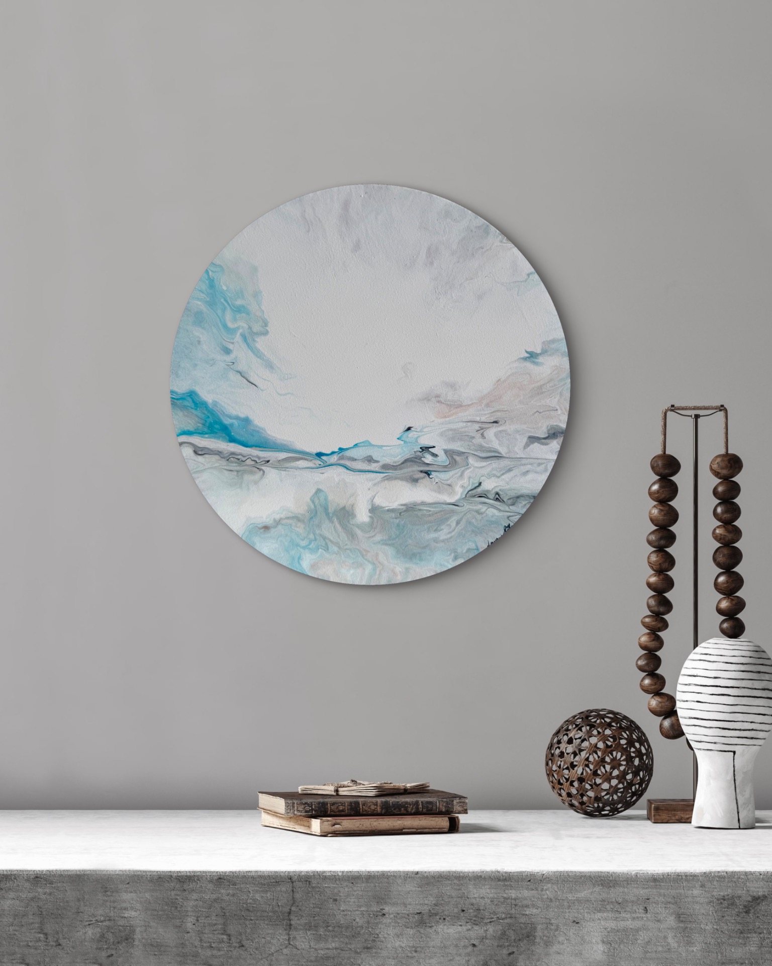 Utuisen tunnelman vaaleansinivalkoinen taivaanrantamaalaus, jossa ripaus beigeä ja harmaata.