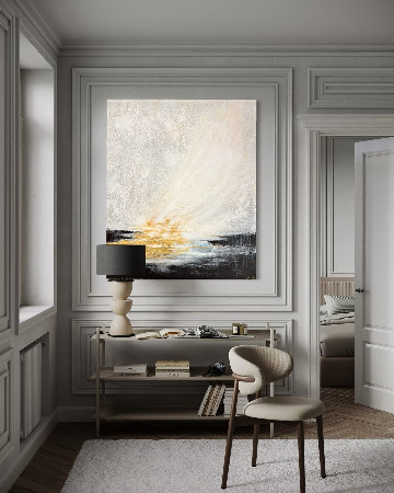 Klassisen värimaailman näyttävä pystysuuntainen teos, johon tuo ylellisyyttä kultainen lyöntimetalli.