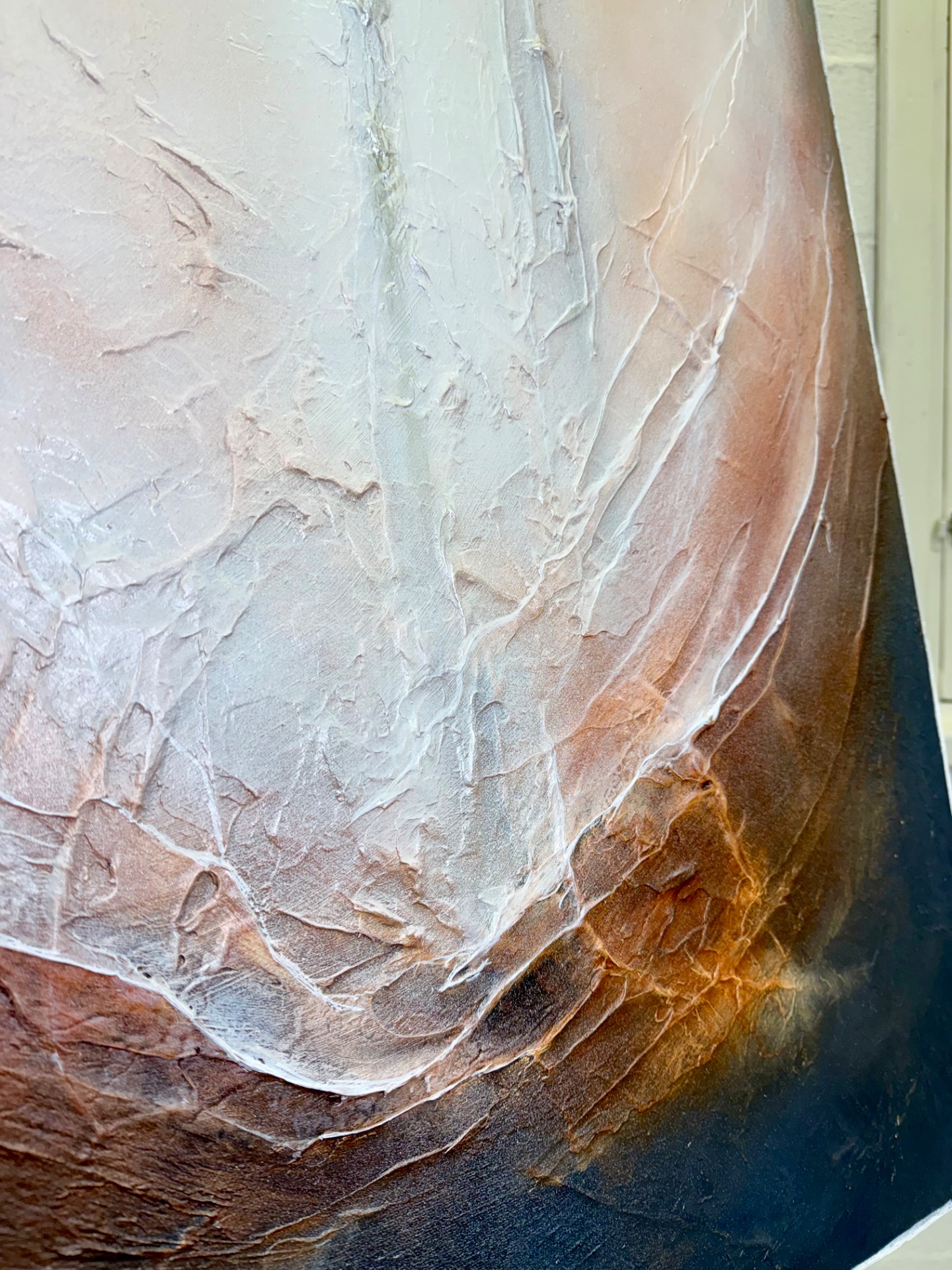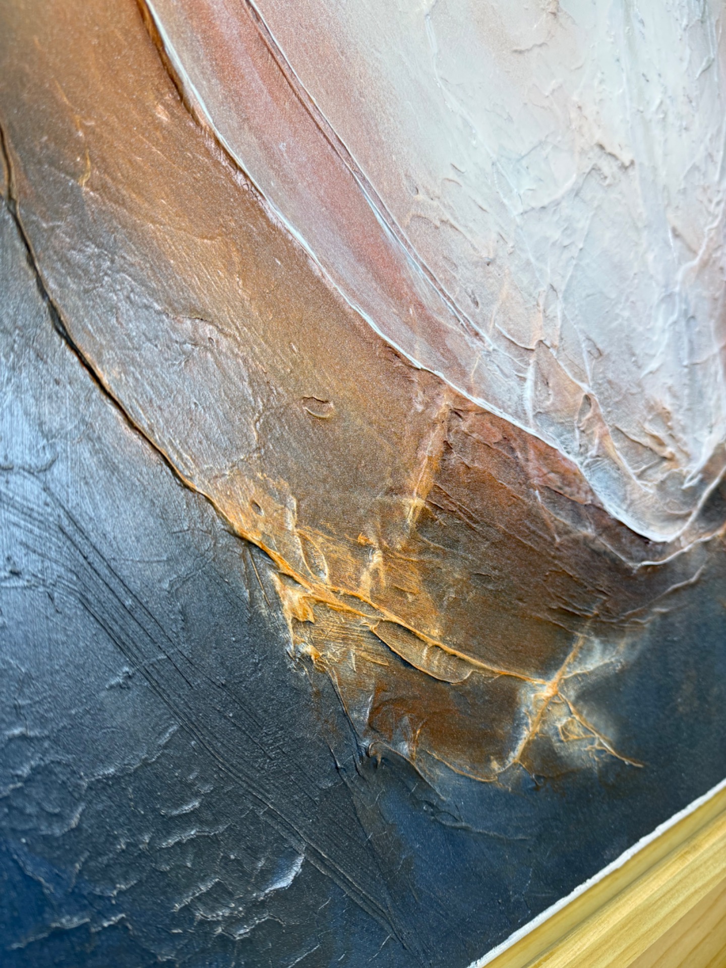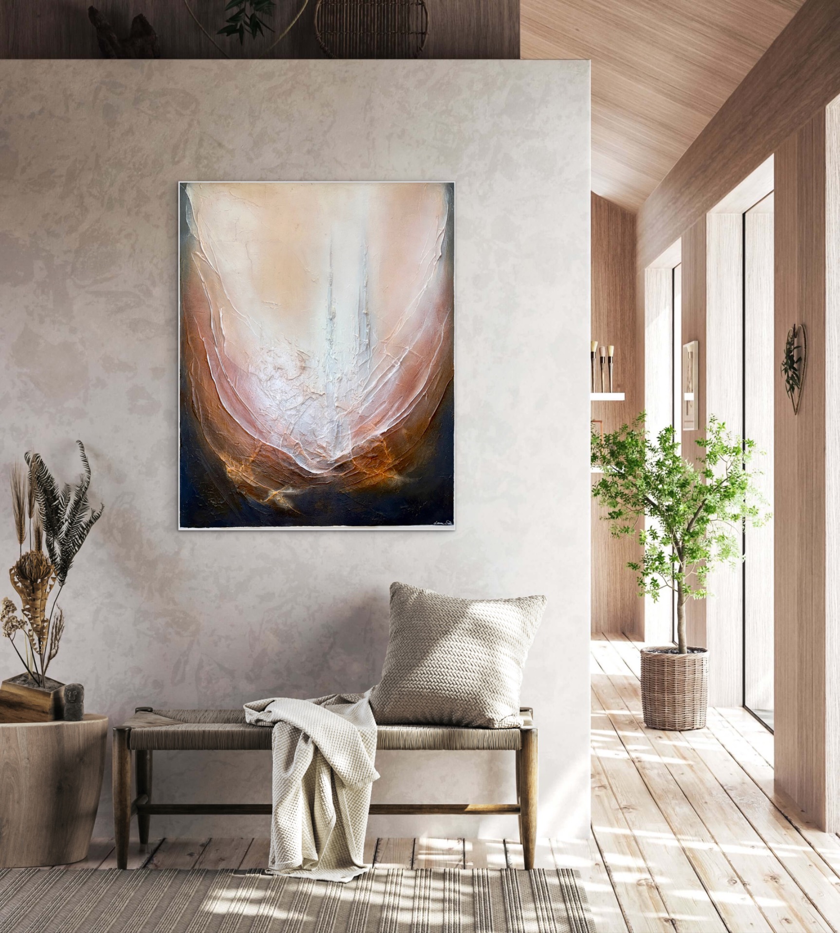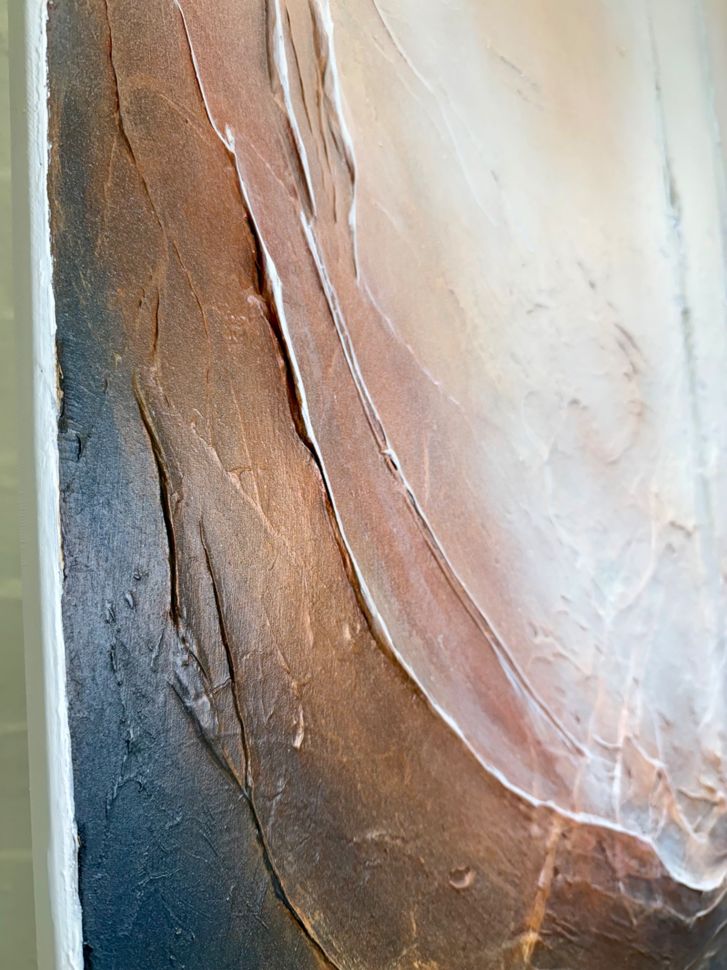 Vahvasti strukturoidulla pohjalla ruskeasävyinen teos, jossa ripaus hopeaa.