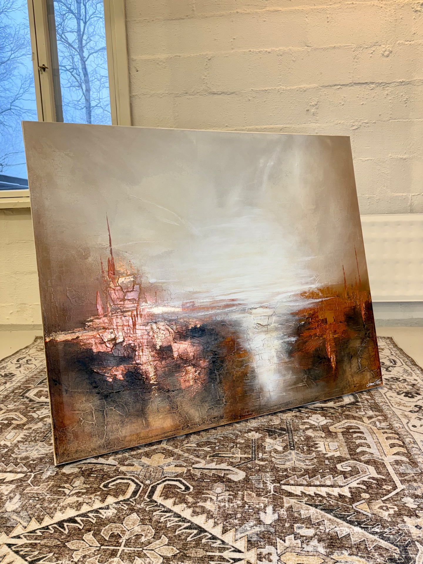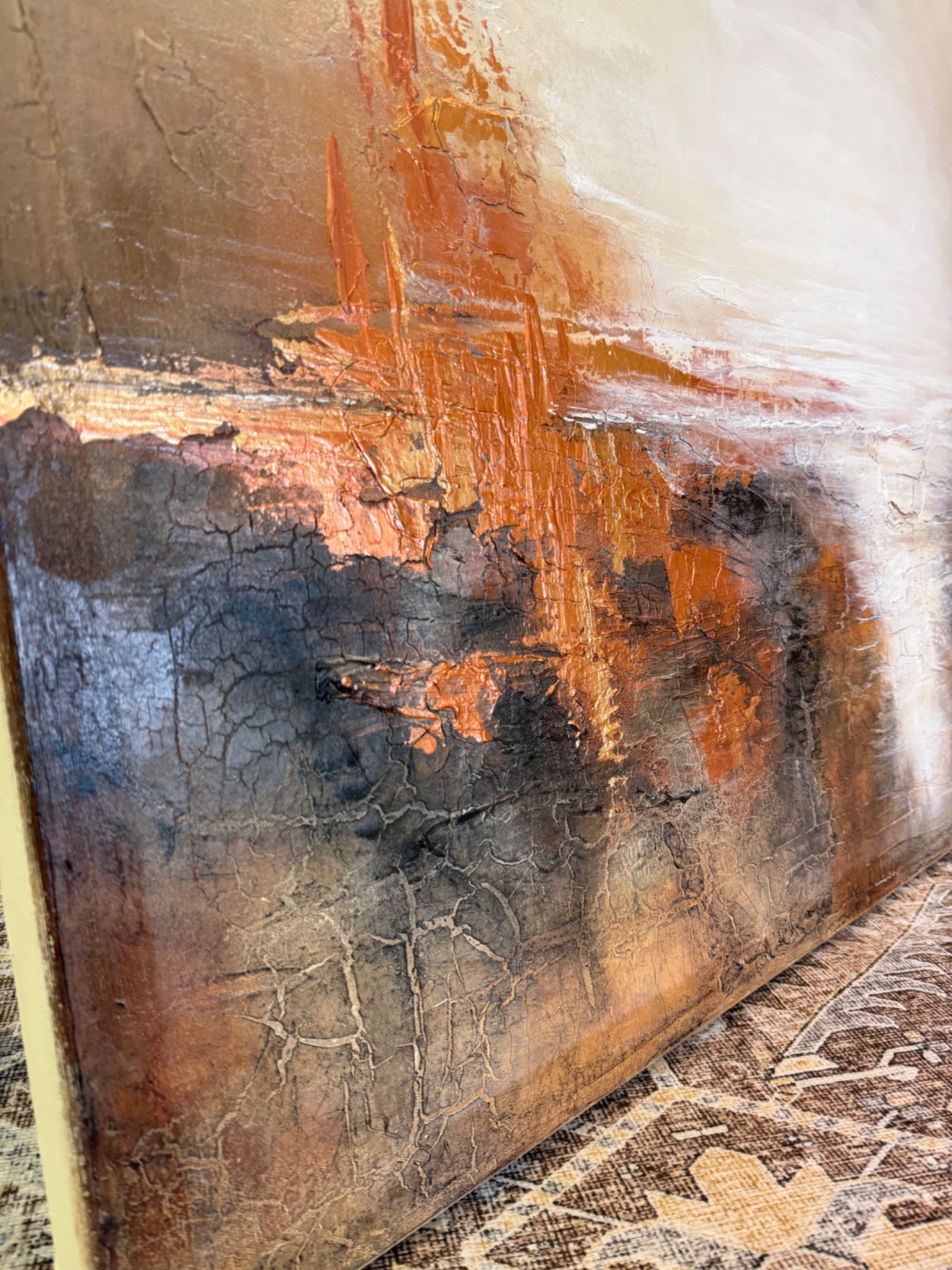 Suuri maanläheisten sävyjen maalaus, johon kuparin hehku luo ylellisyyttä.