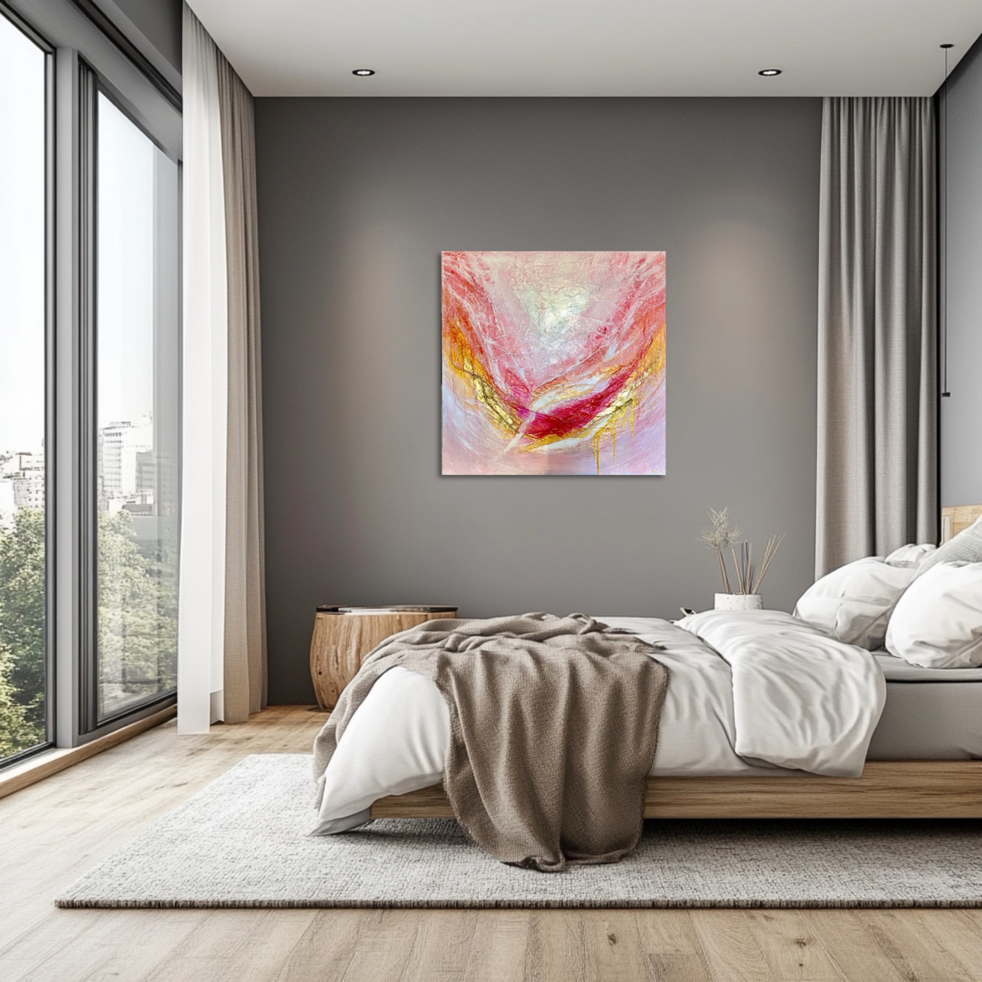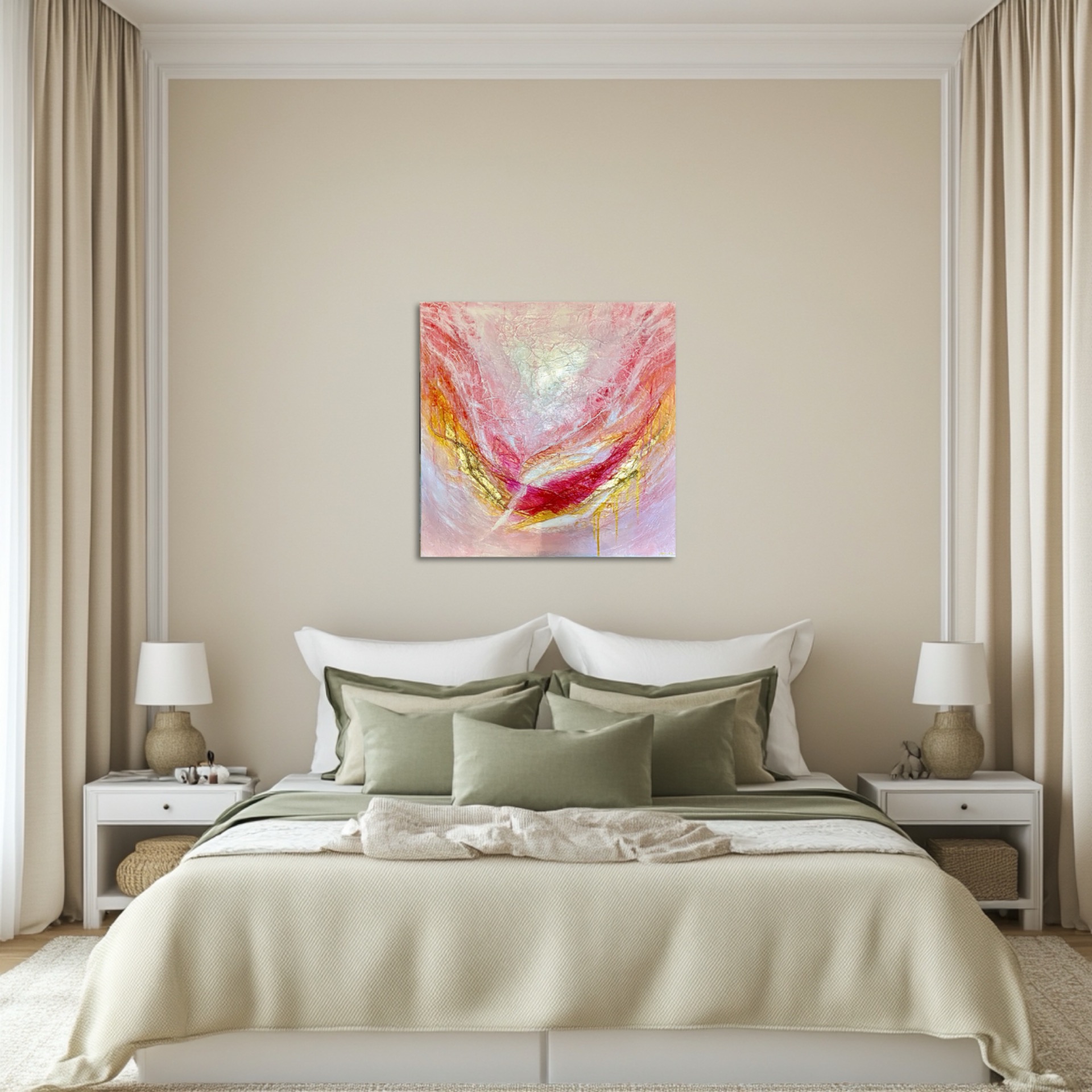 Herkullinen vaaleanpunainen työ kultaisilla yksityiskohdilla. Ripustusvalmis.