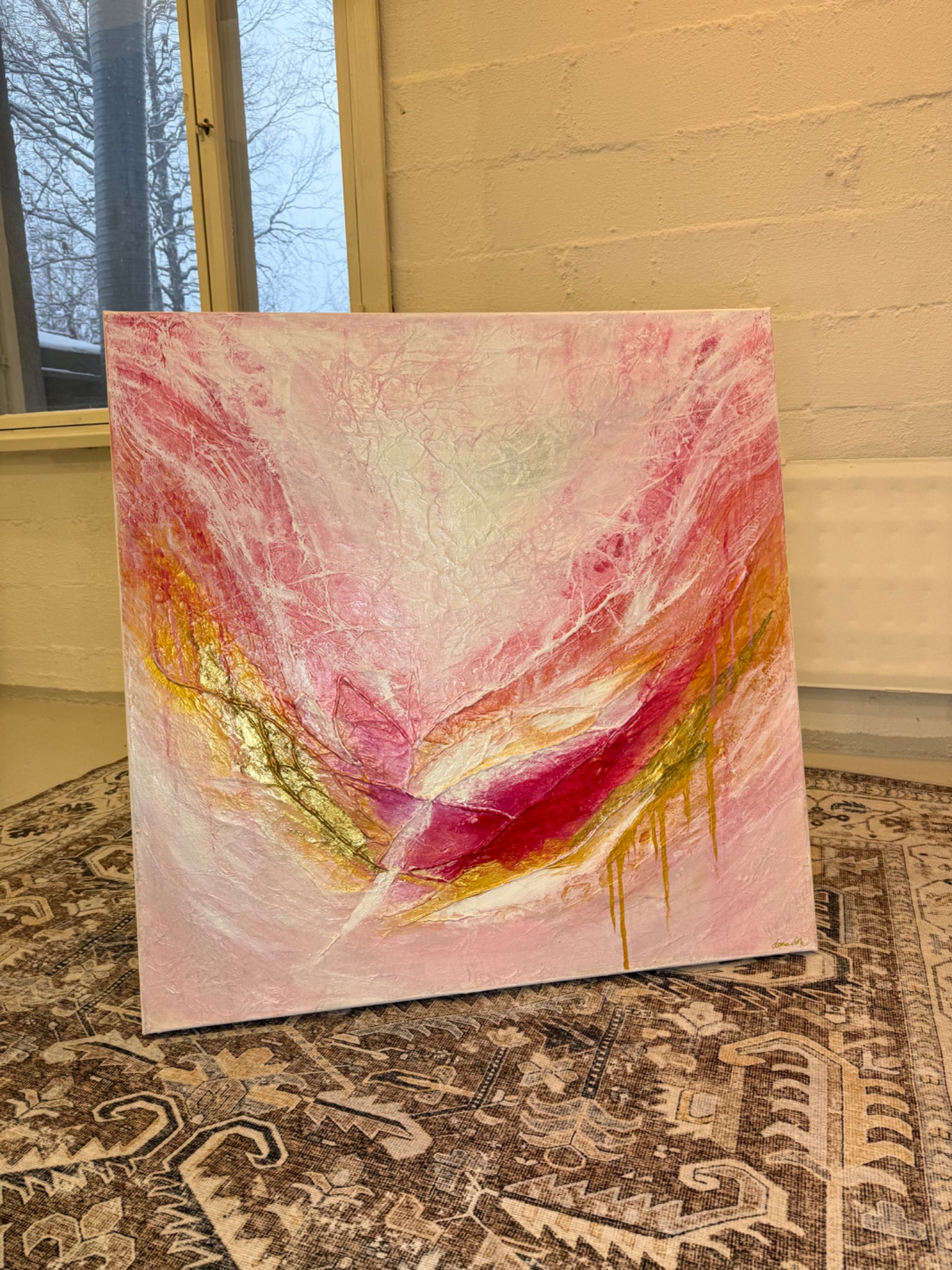 Herkullisen vaaleanpunainen maalaus kultaisella lyöntimetallilla.