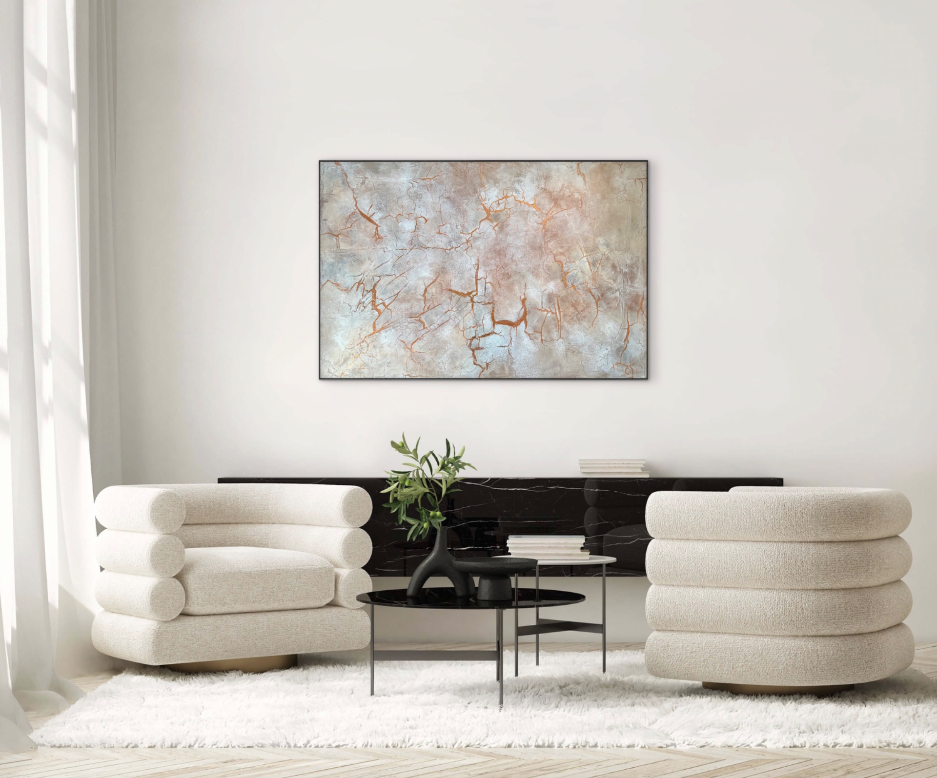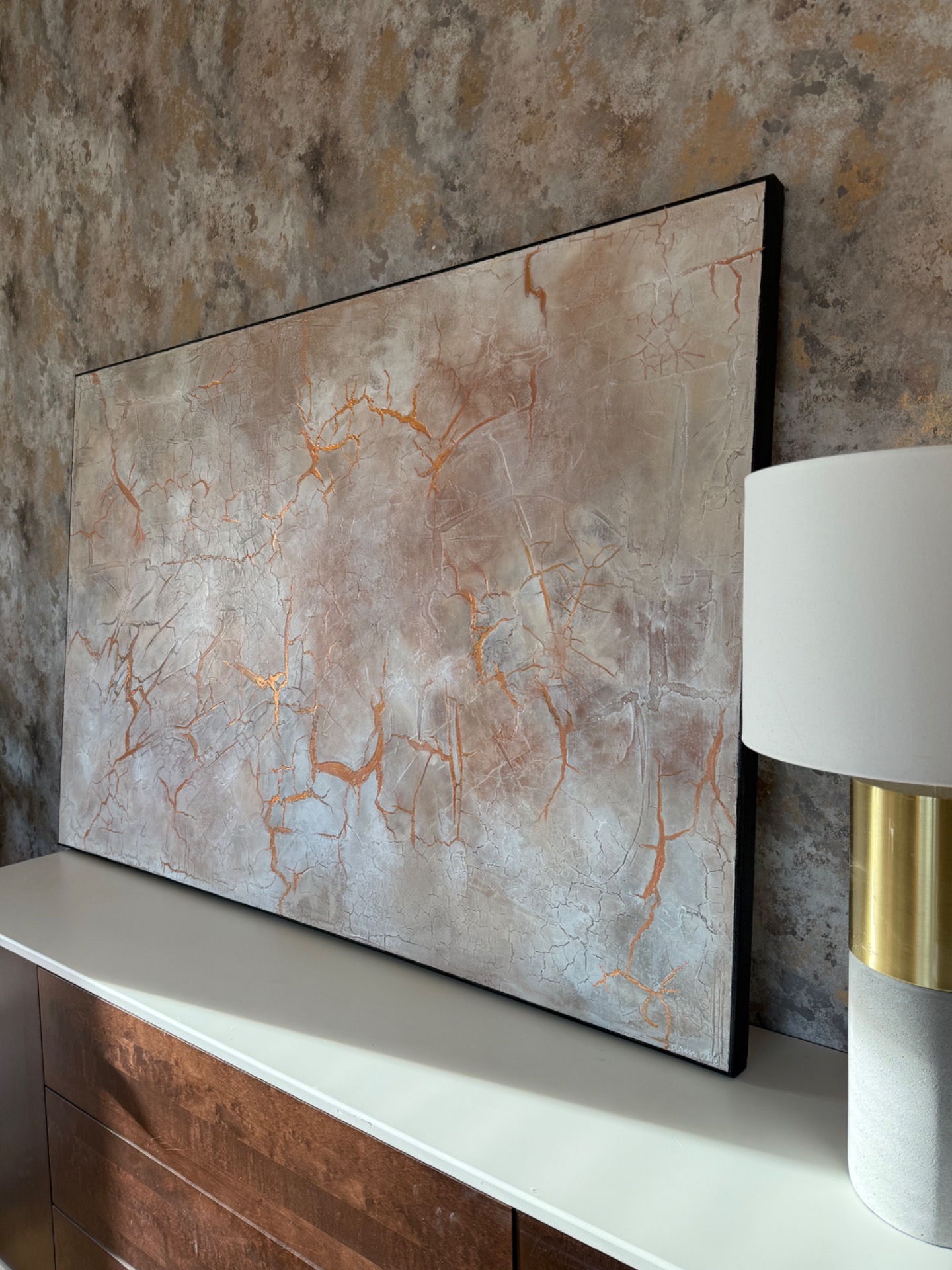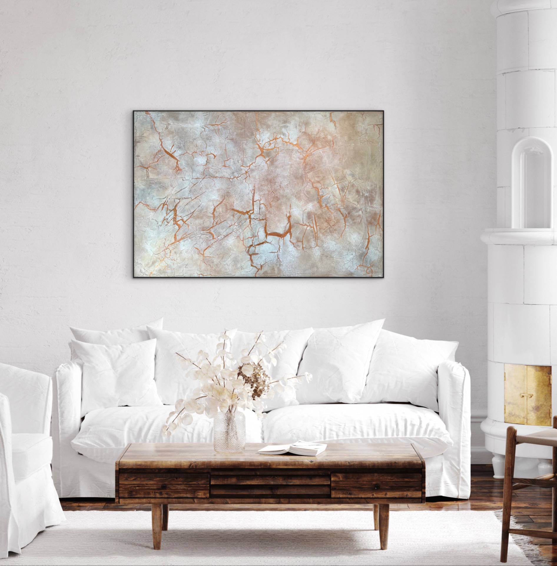 Erittäin suurikokoinen, harmonisen vaaleiden maanläheisten sävyjen (harmaa, beige, valkoisen sävyt) teos halkeilevalla strukturoidulla pohjalla ja kiehtovilla lyöntimetalliyksityiskohdilla. Maalatut tummanharmaat kehykset.