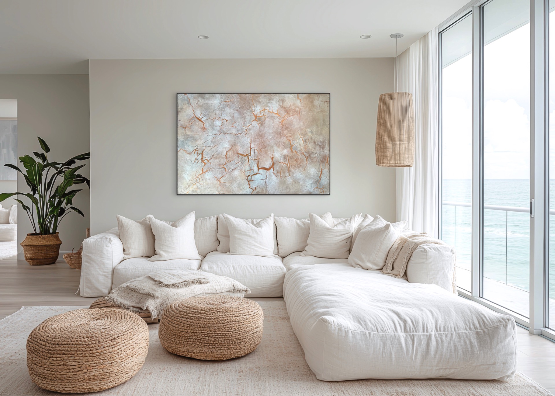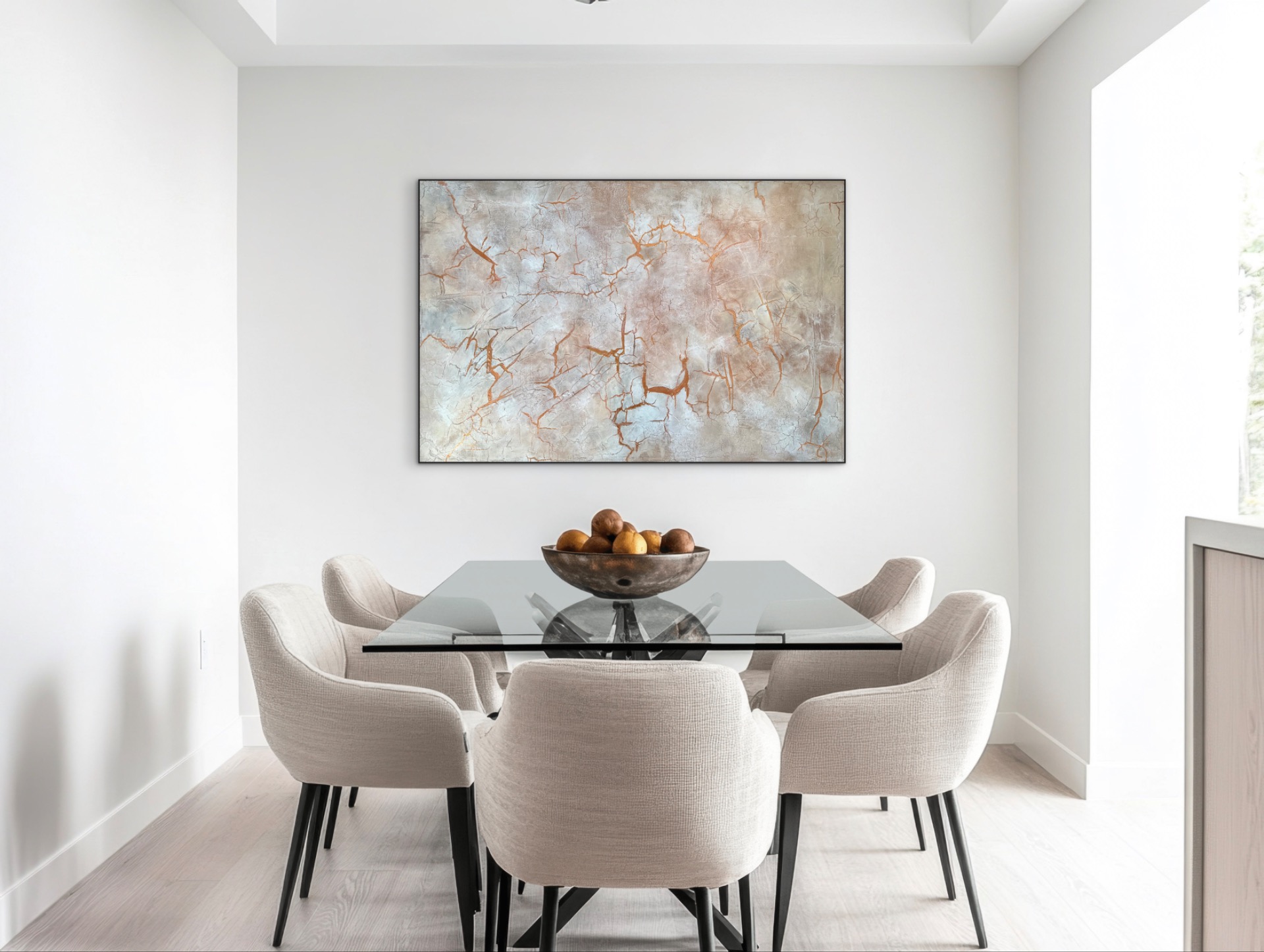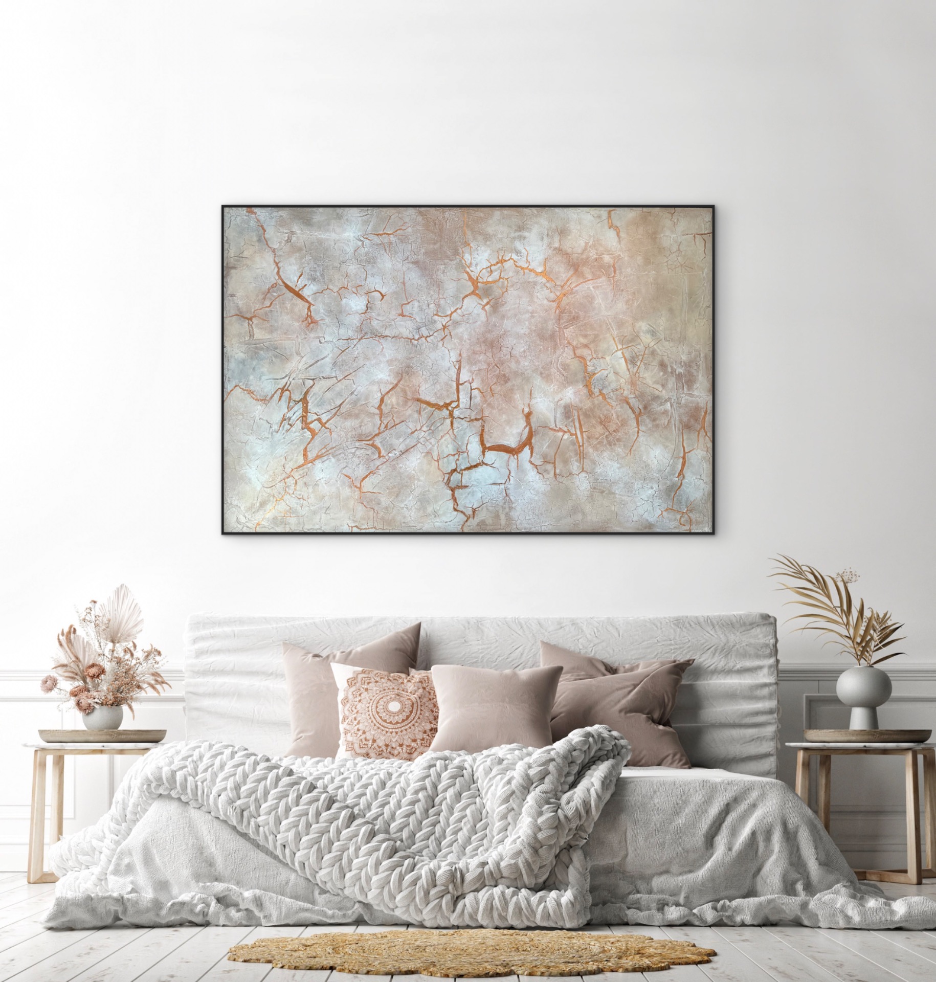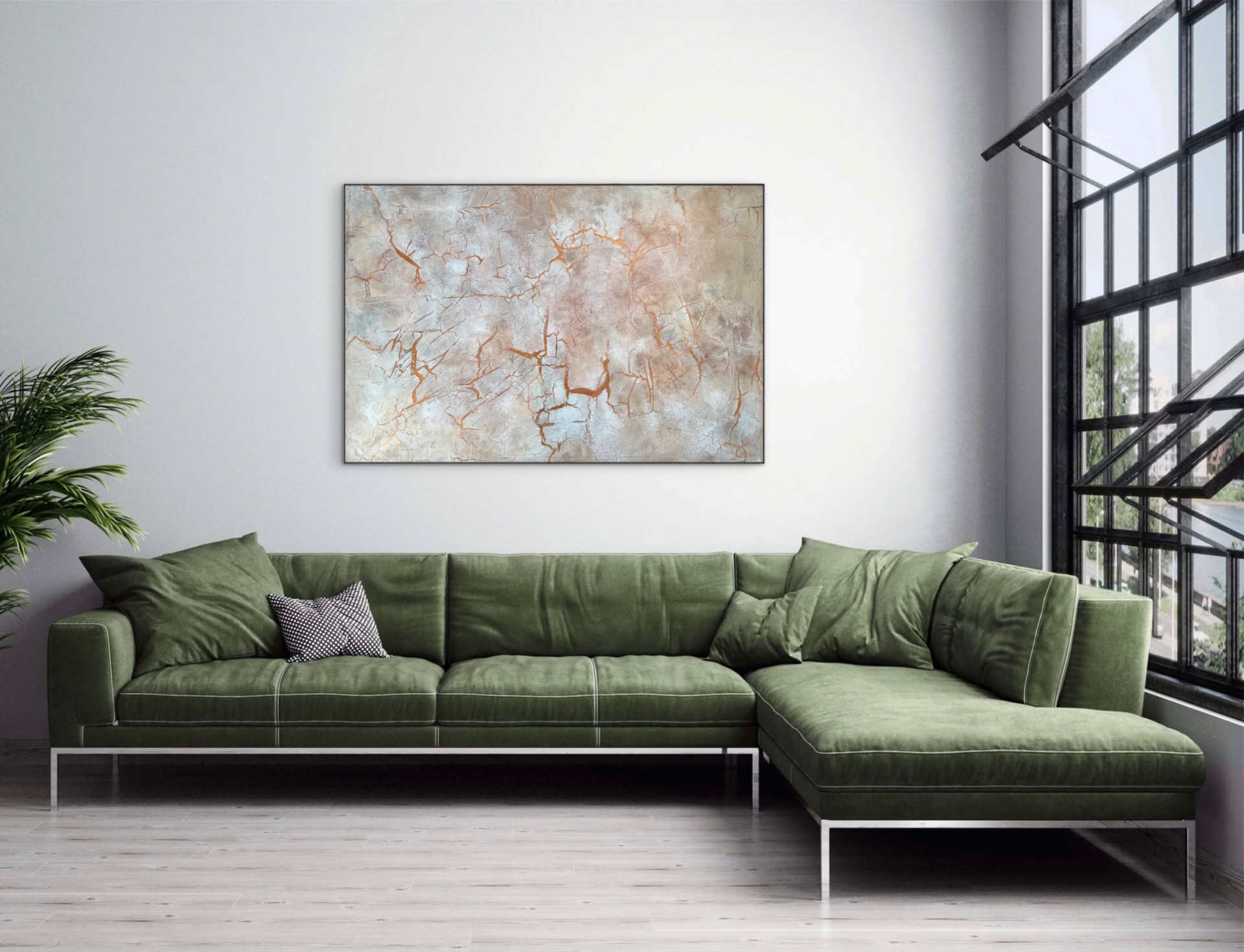 Erittäin suurikokoinen, harmonisen vaaleiden maanläheisten sävyjen (harmaa, beige, valkoisen sävyt) teos halkeilevalla strukturoidulla pohjalla ja kiehtovilla lyöntimetalliyksityiskohdilla. Maalatut tummanharmaat kehykset.