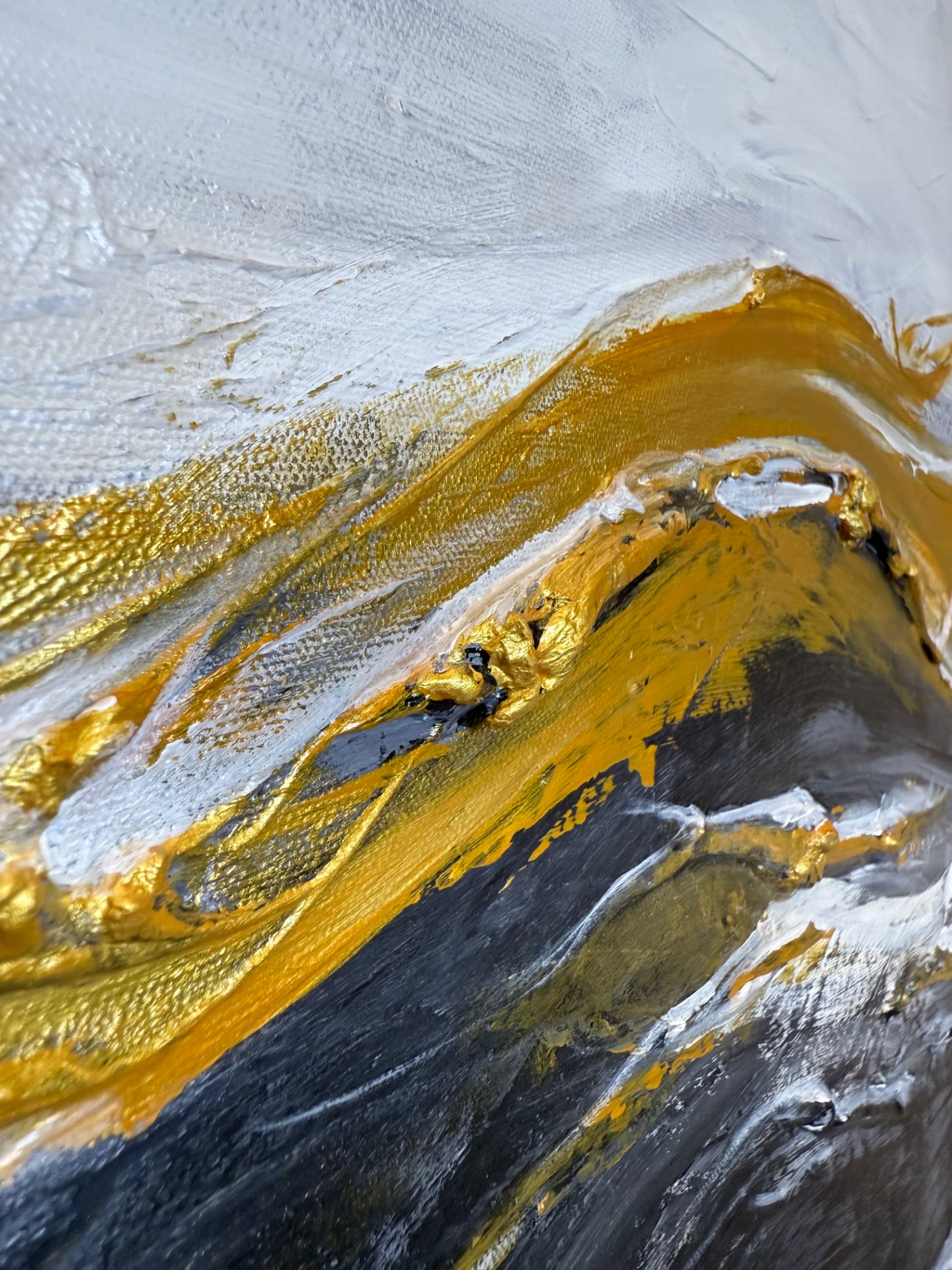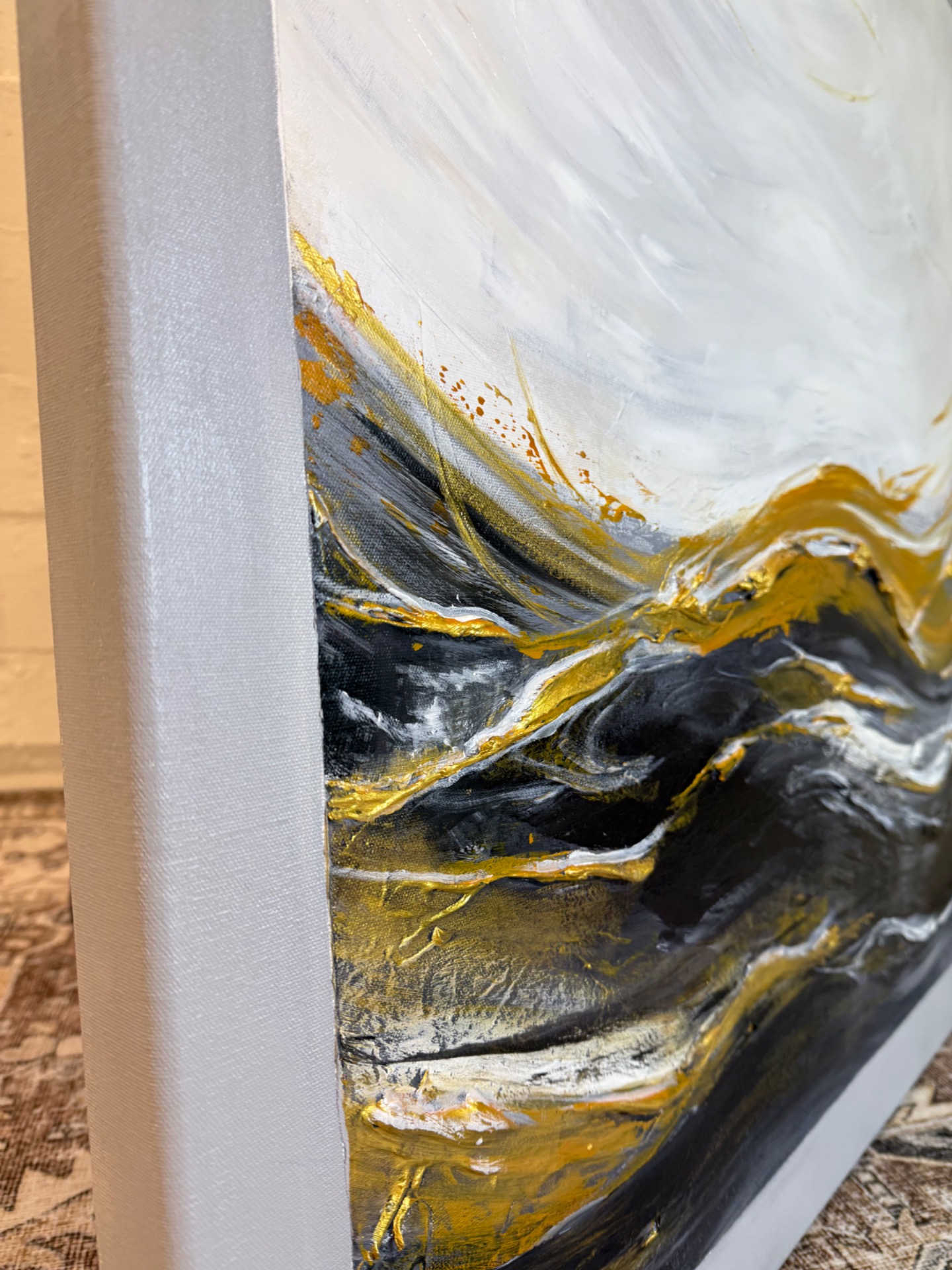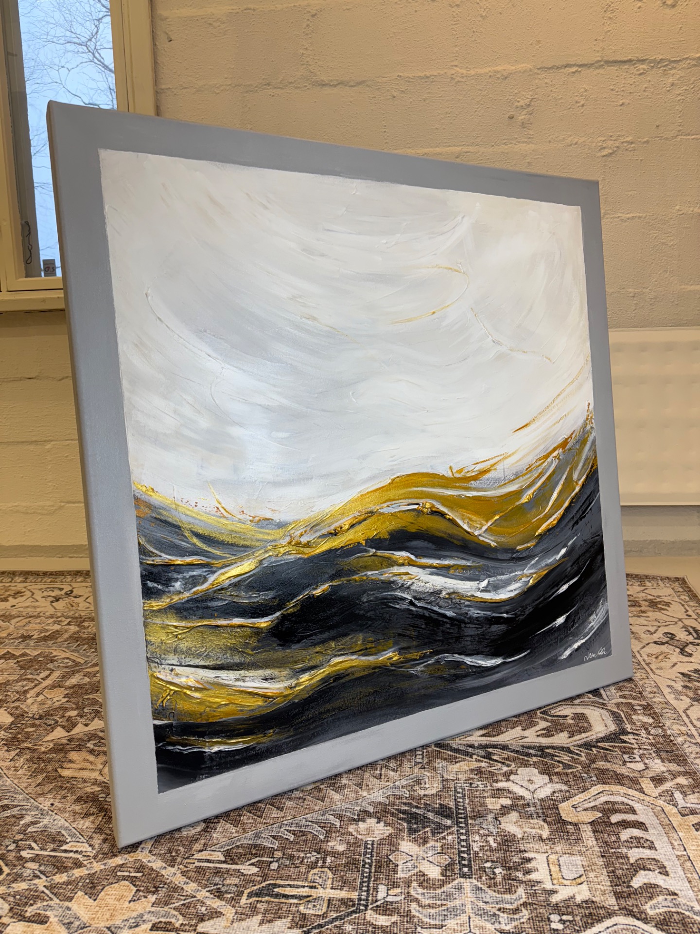 Näyttävän kokoinen, tyylikkään mustavalkoinen maalaus ylellisillä kultaisilla yksityiskohdilla. Maalatut harmaat kehykset.