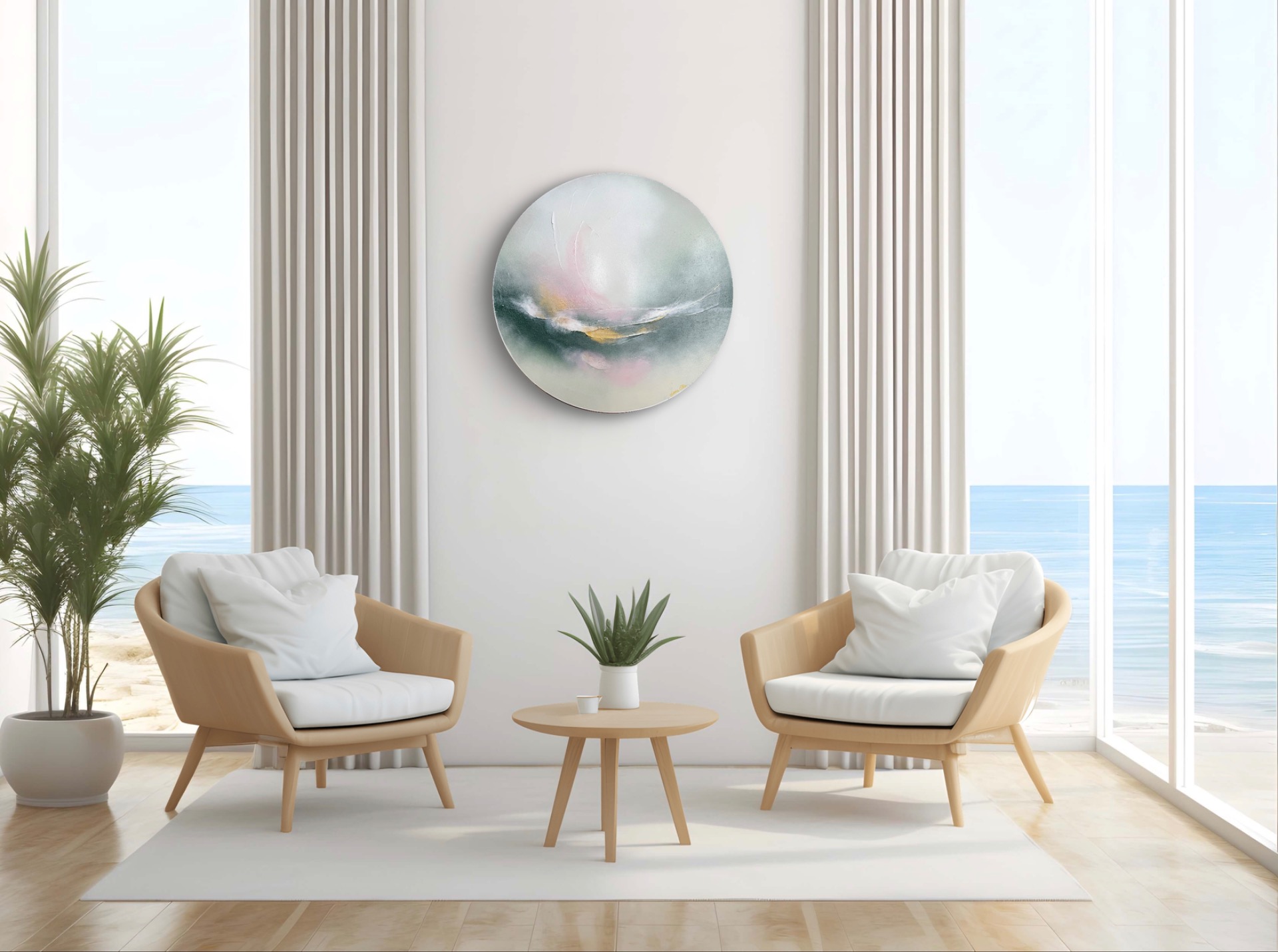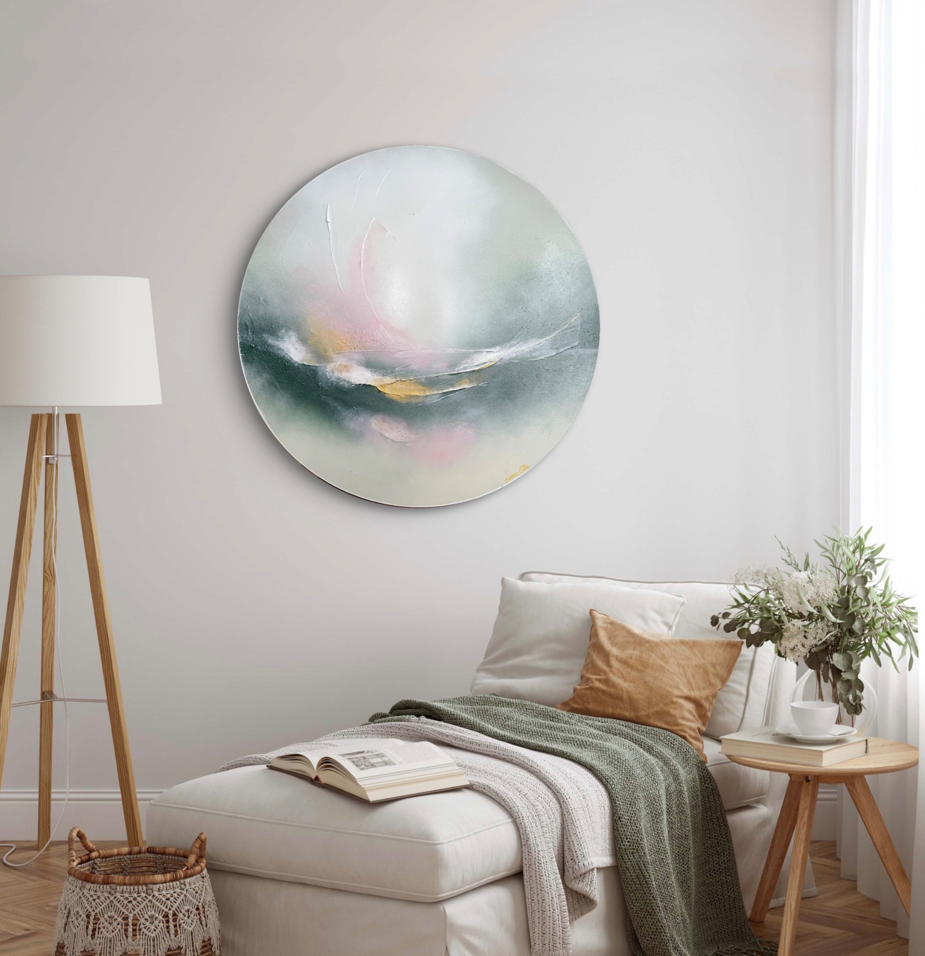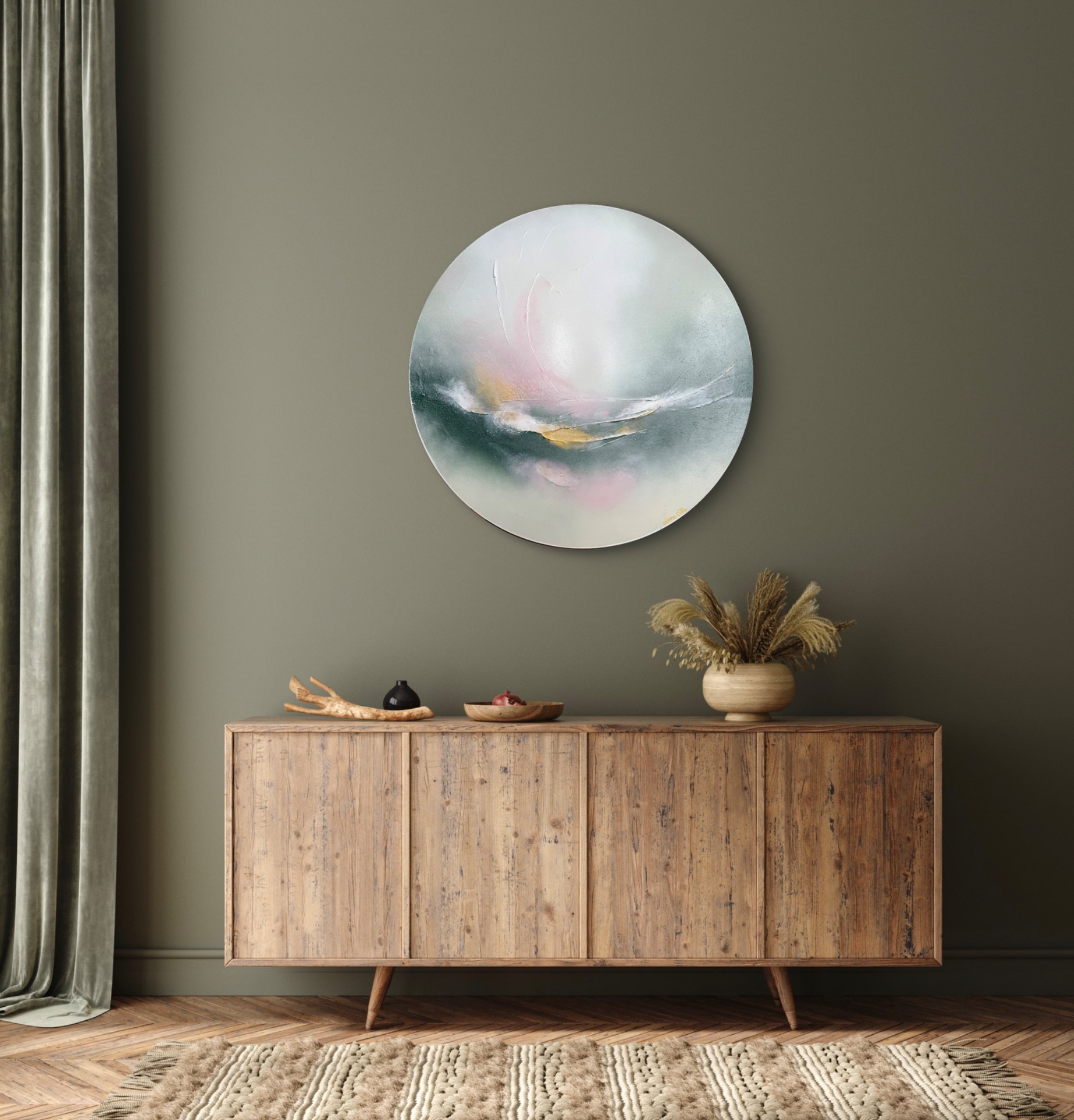 Pyöreä maalaus, jonka halkaisija 76 cm ”Kesäyön valo” sarjasta.