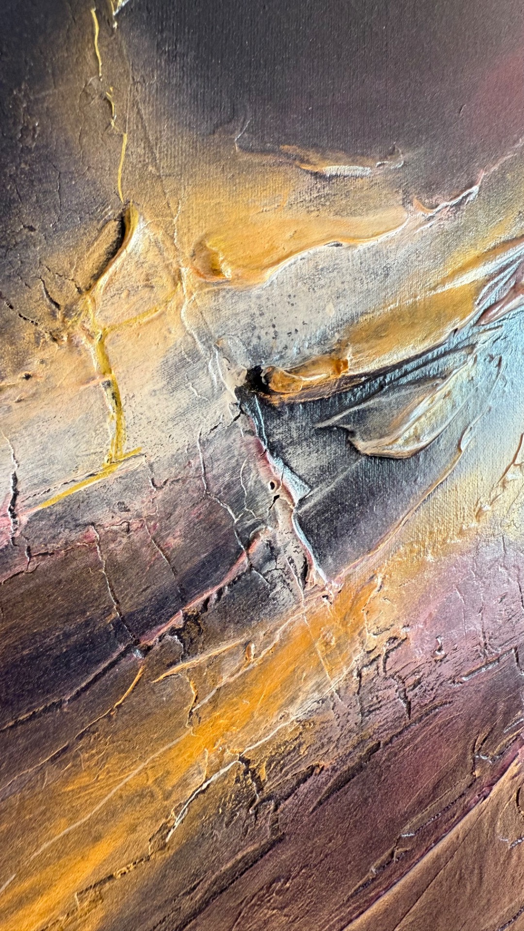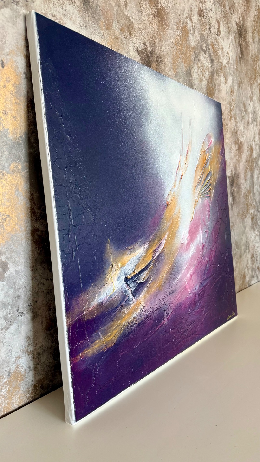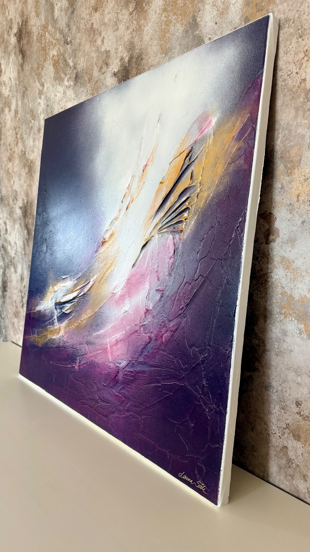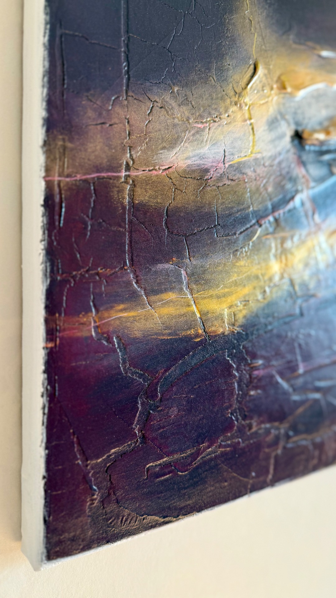 Mystisen violetin ja koristeellisten kultaisten yksityiskohtien vaikuttava keskikokoinen teos strukturoidulla pohjalla.