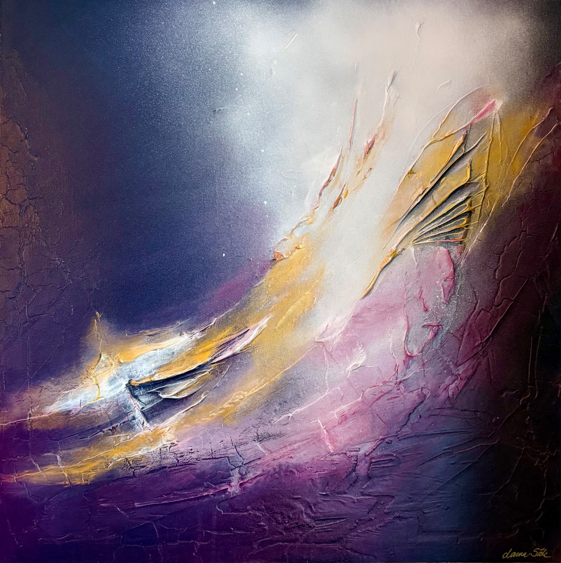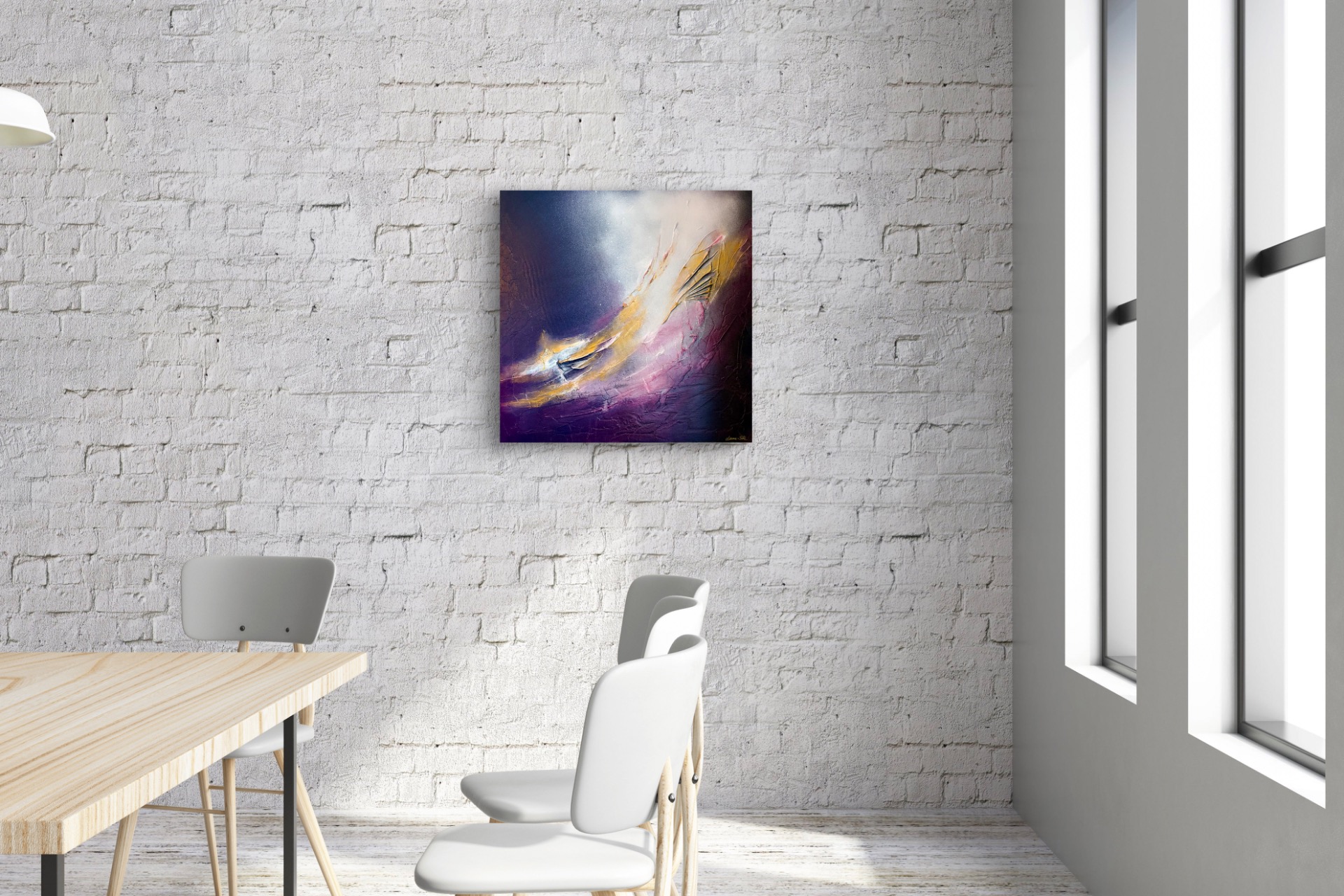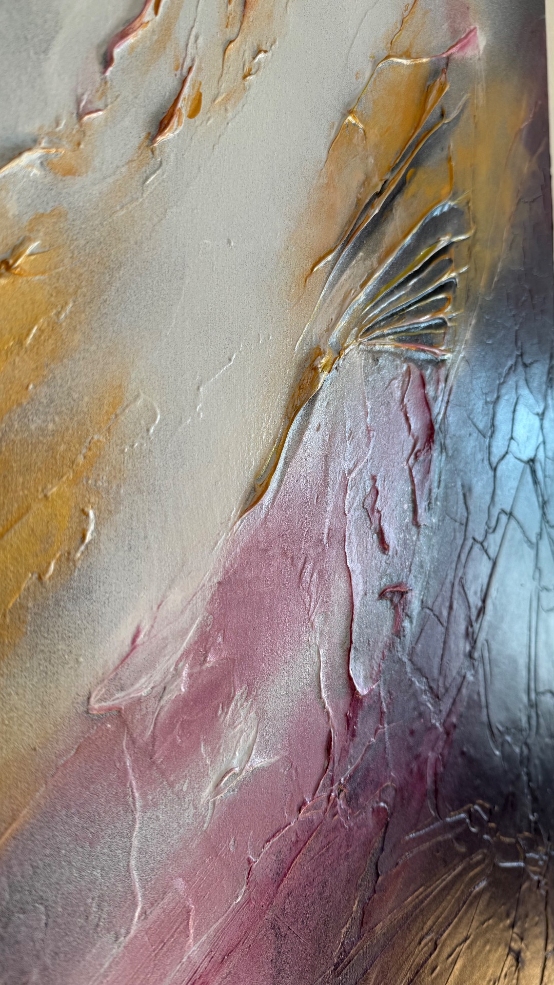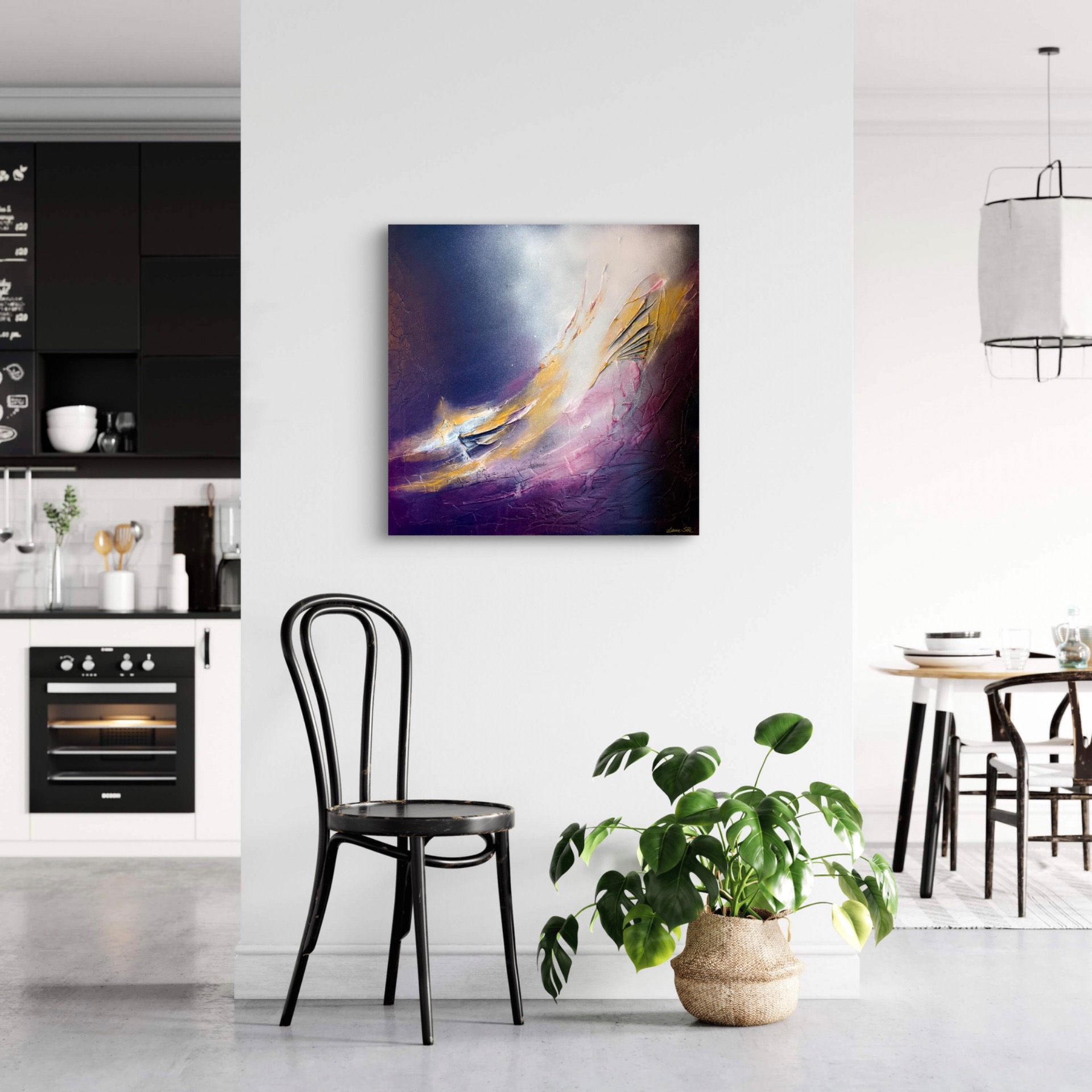 Mystisen violetin ja koristeellisten kultaisten yksityiskohtien vaikuttava keskikokoinen teos strukturoidulla pohjalla.
