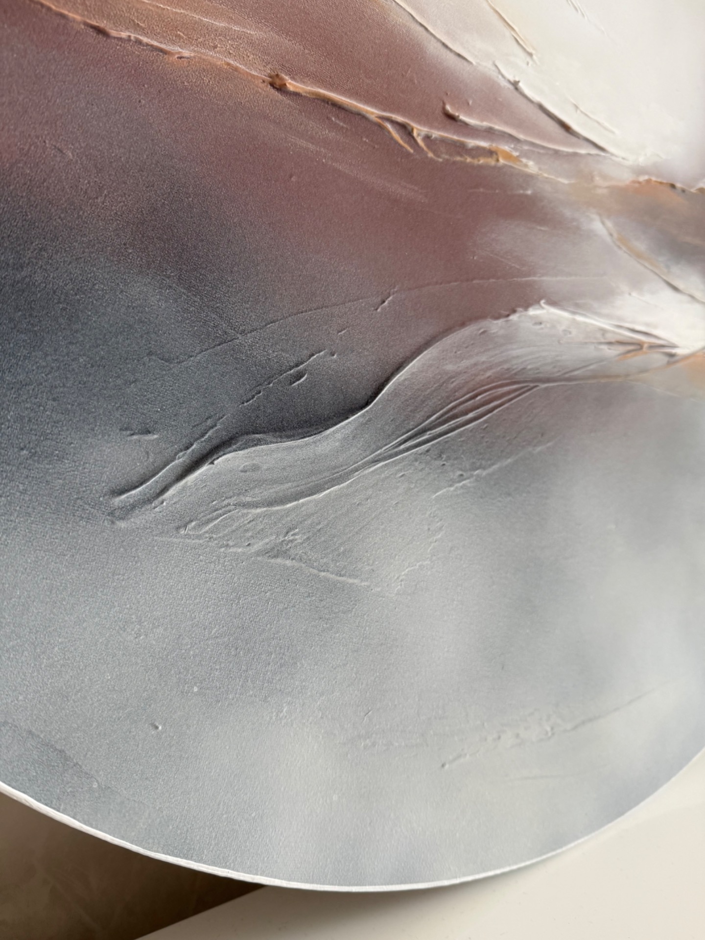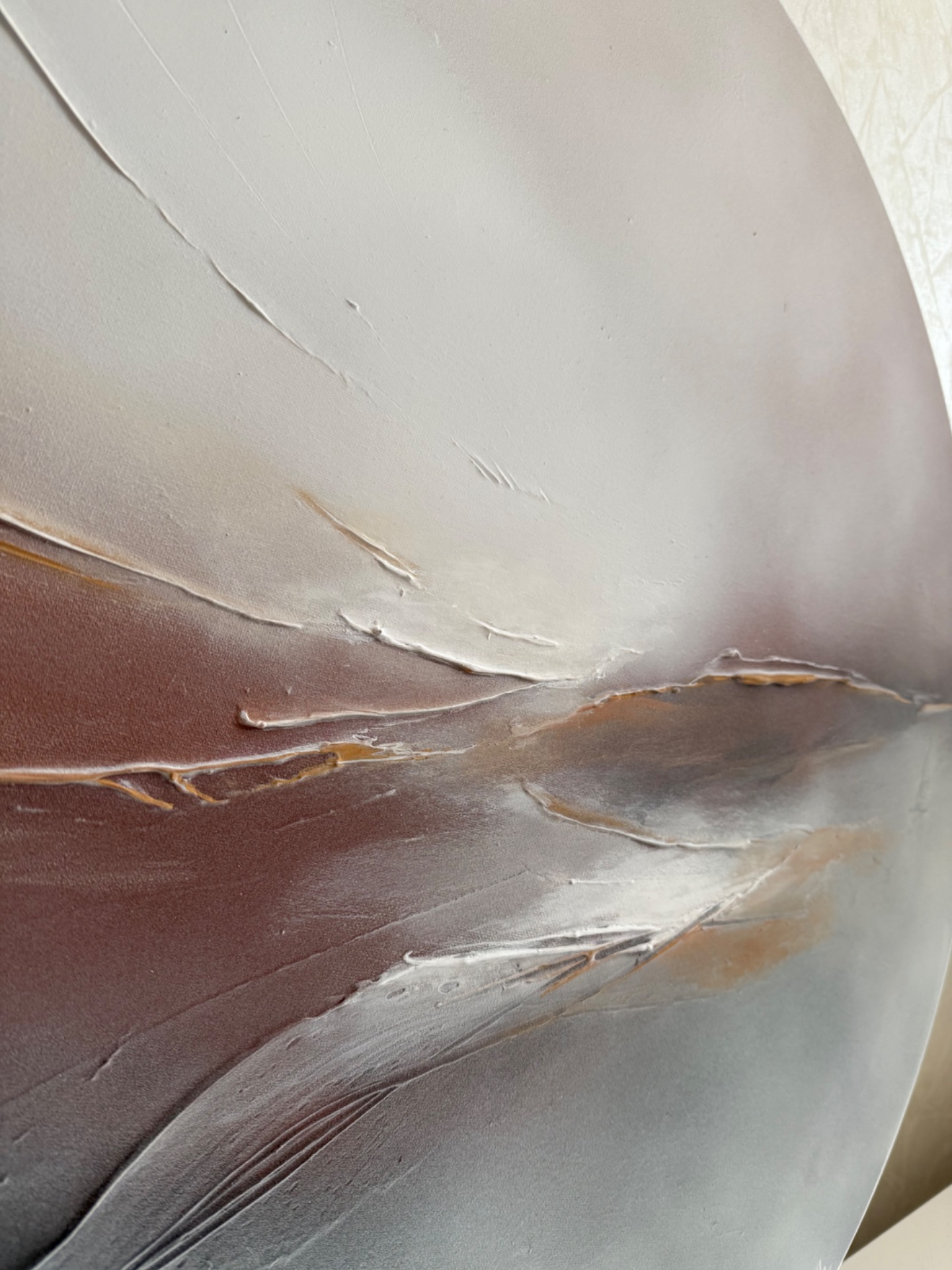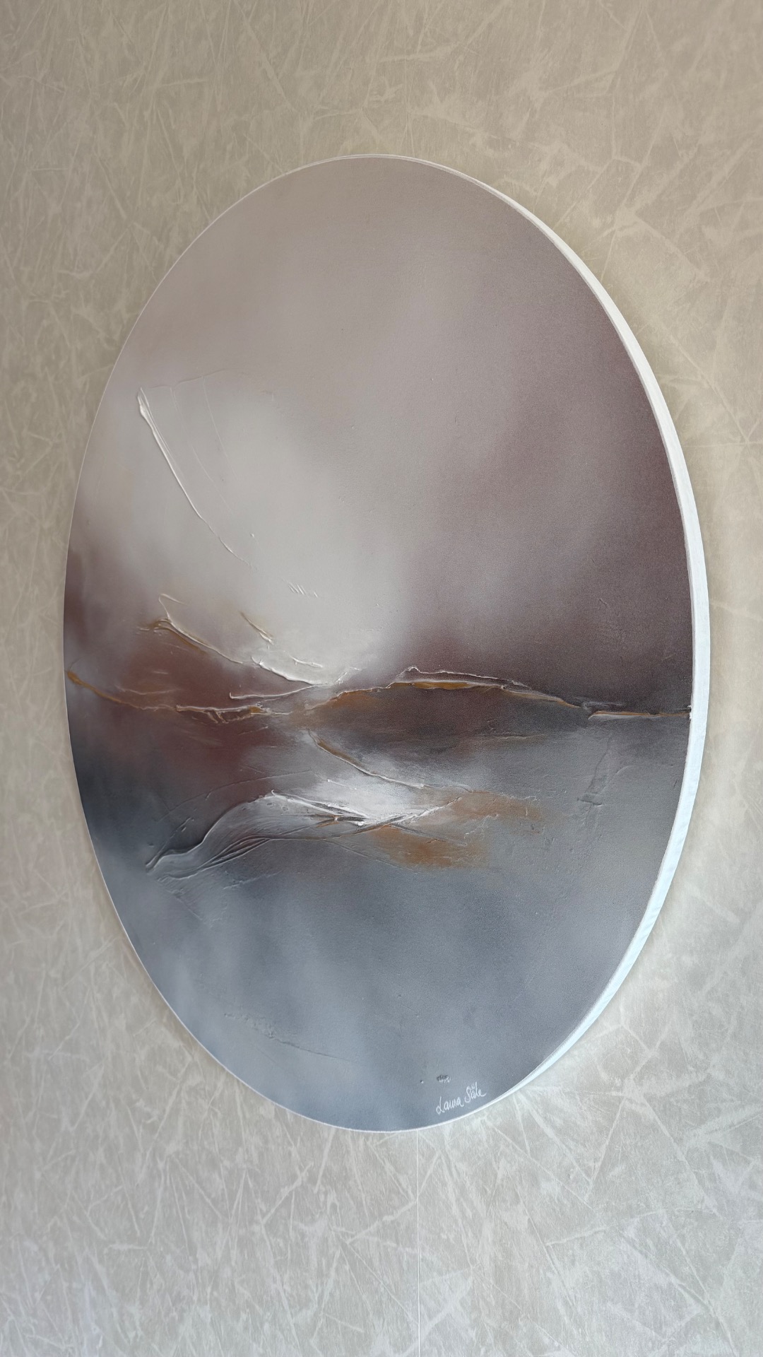 Tässä teoksessa on nimensä mukaisesesti pehmeän utuinen tunnelma maanläheisissä ruskean ja harmaan sävyissä strukturoidulla pohjalla. Yksityiskohdissa ripaus lämmintä pronssia. Suurehko keskikoko sopii moneen tilaan kauniiksi katseenkiinnittäjäksi.