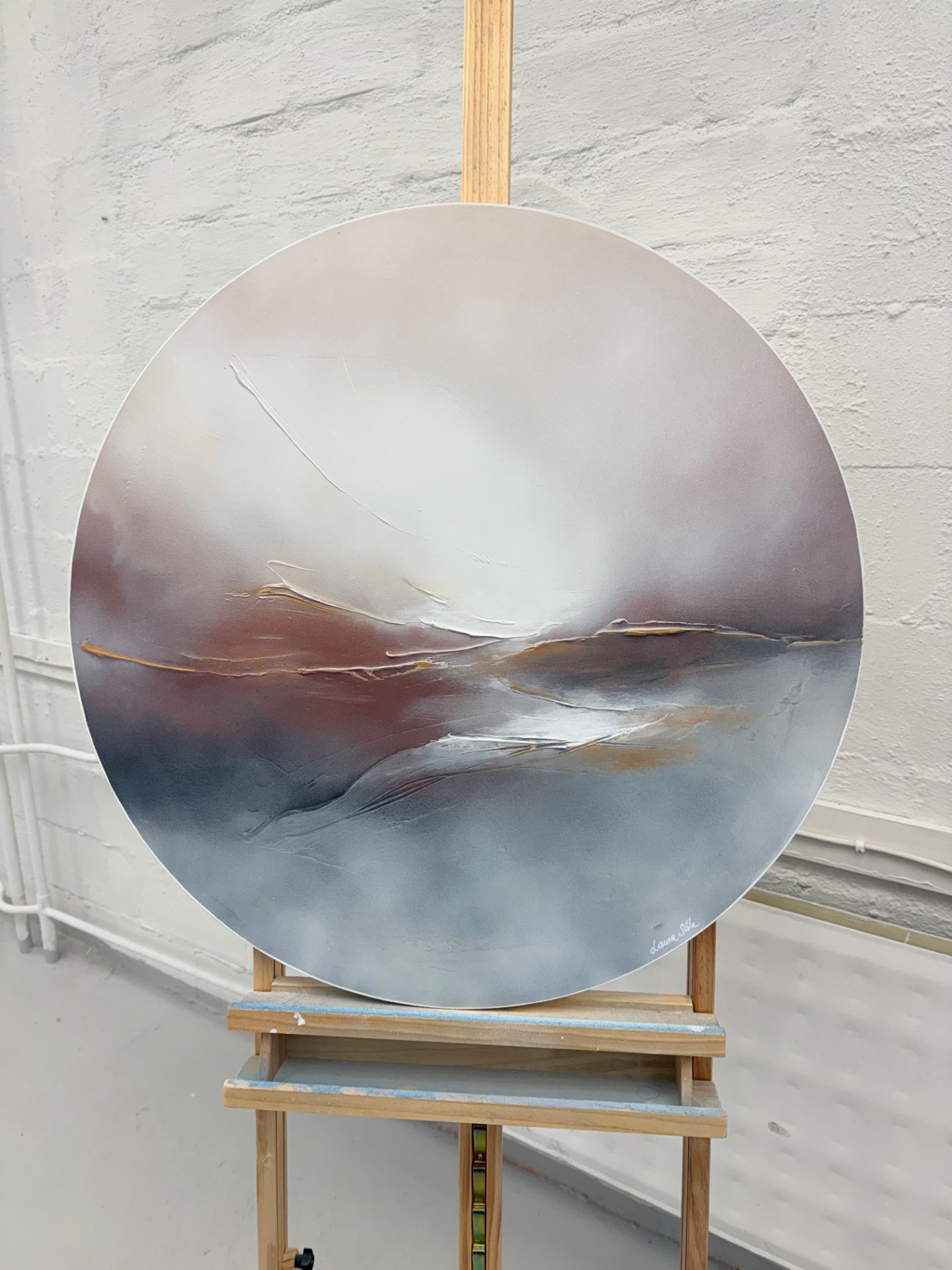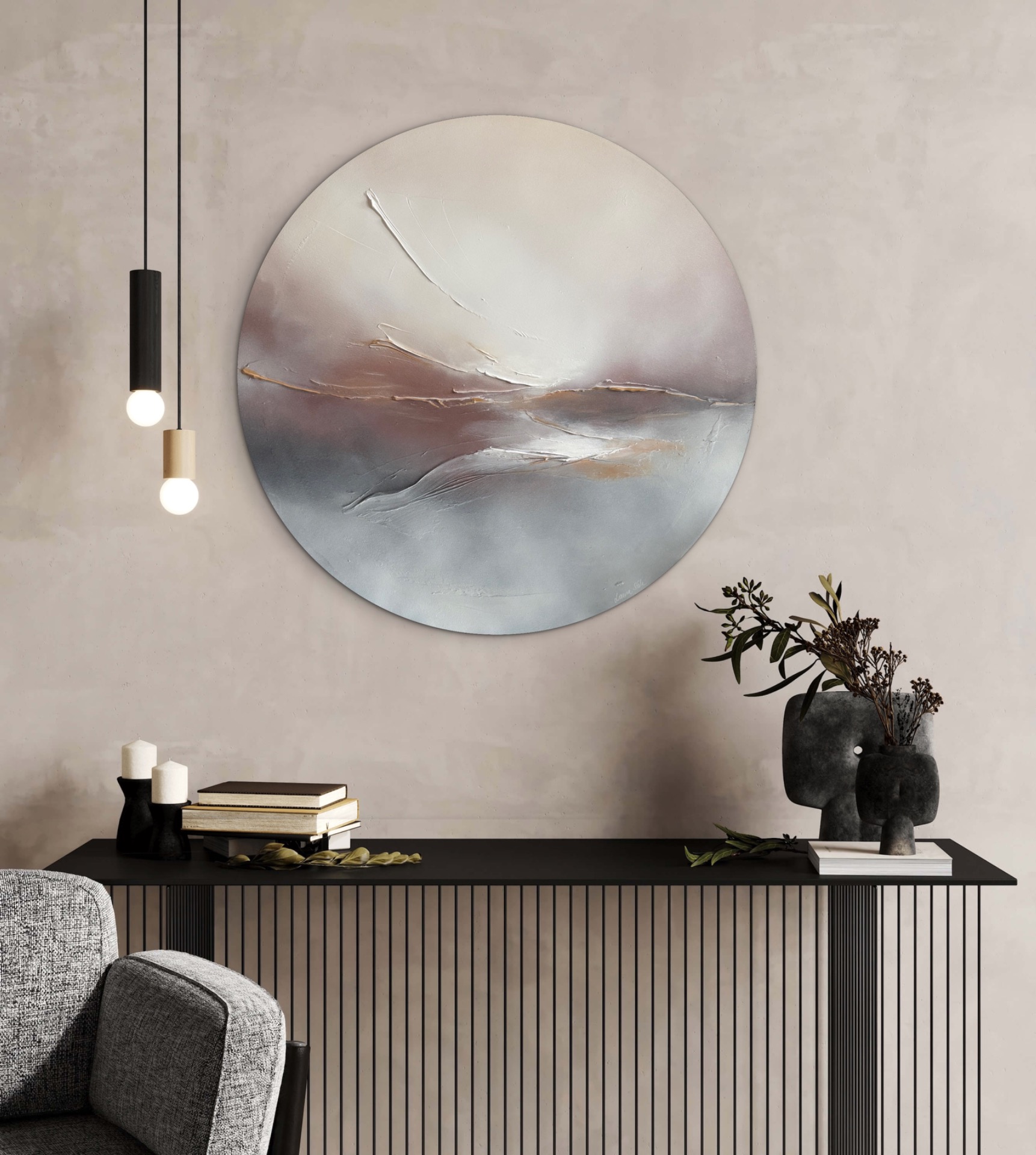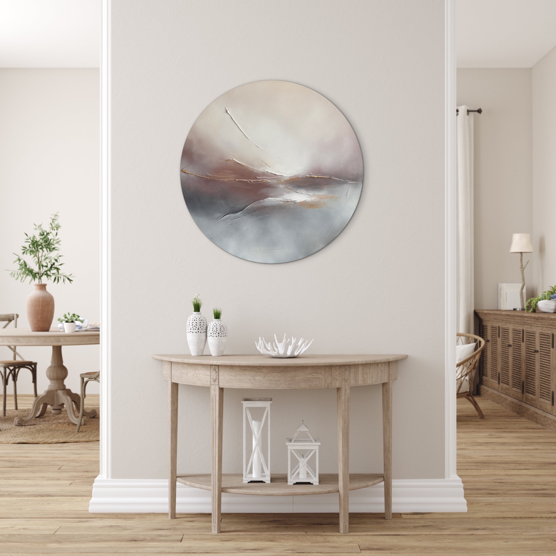 Utuisen tunnelman moderni taivaanrantamaalaus maanläheisissä sävyissä, jonka halkaisija on 76 cm.