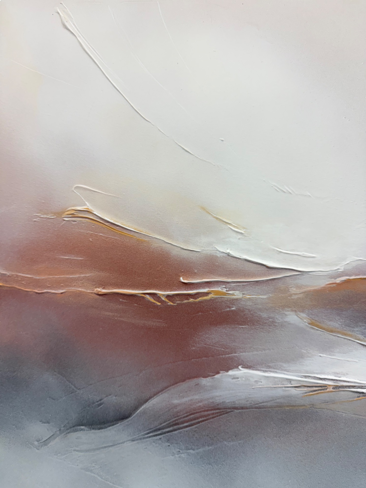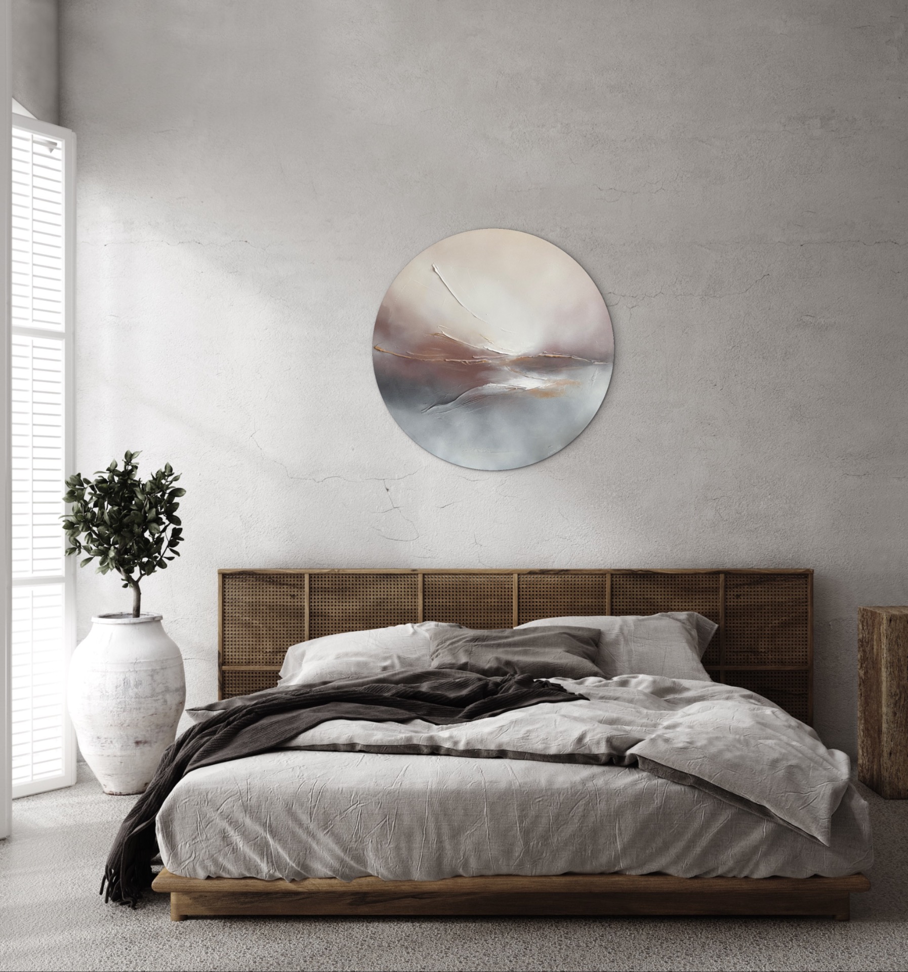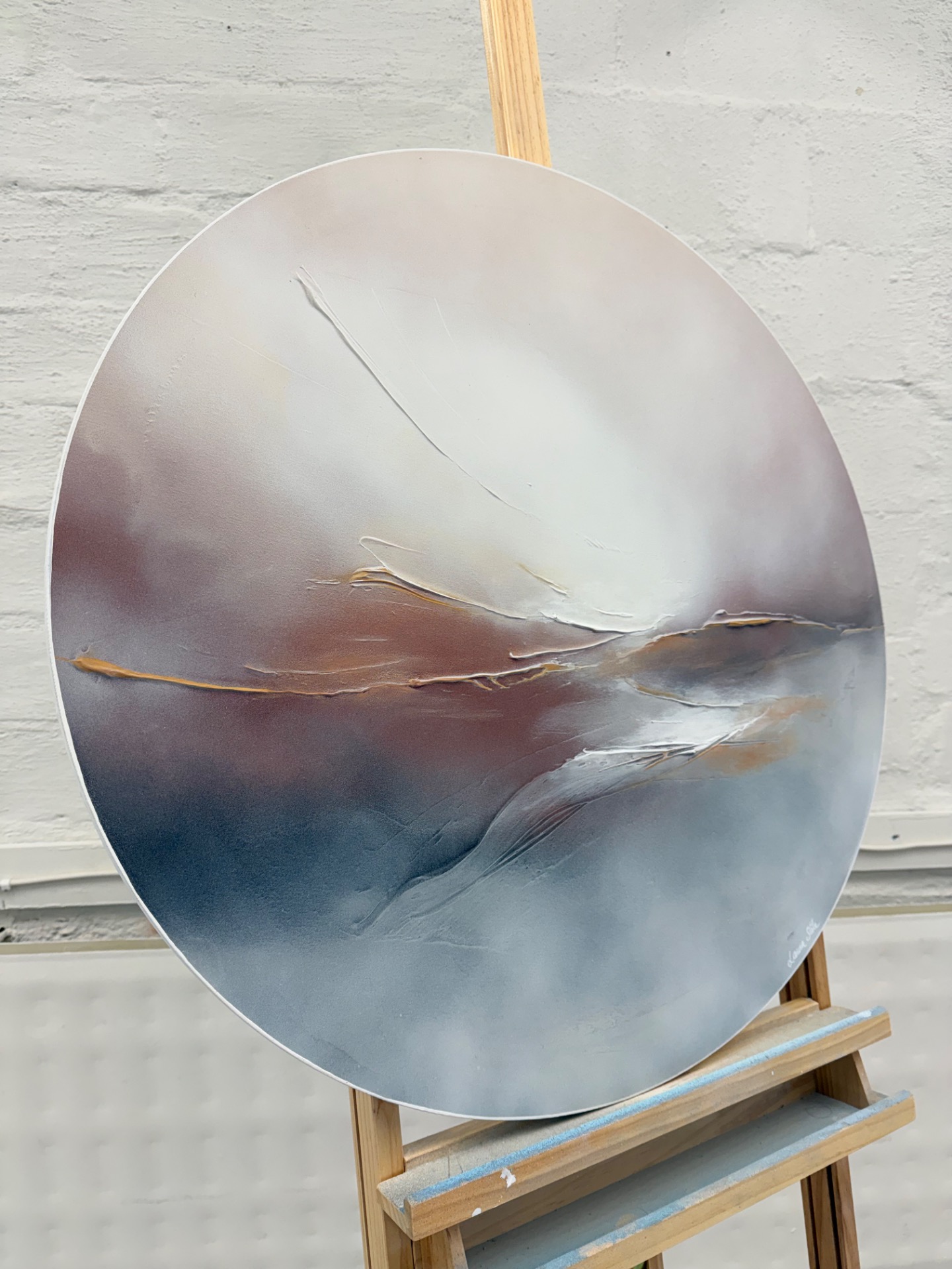 Utuisen tunnelman moderni taivaanrantamaalaus maanläheisissä sävyissä, jonka halkaisija on 76 cm.