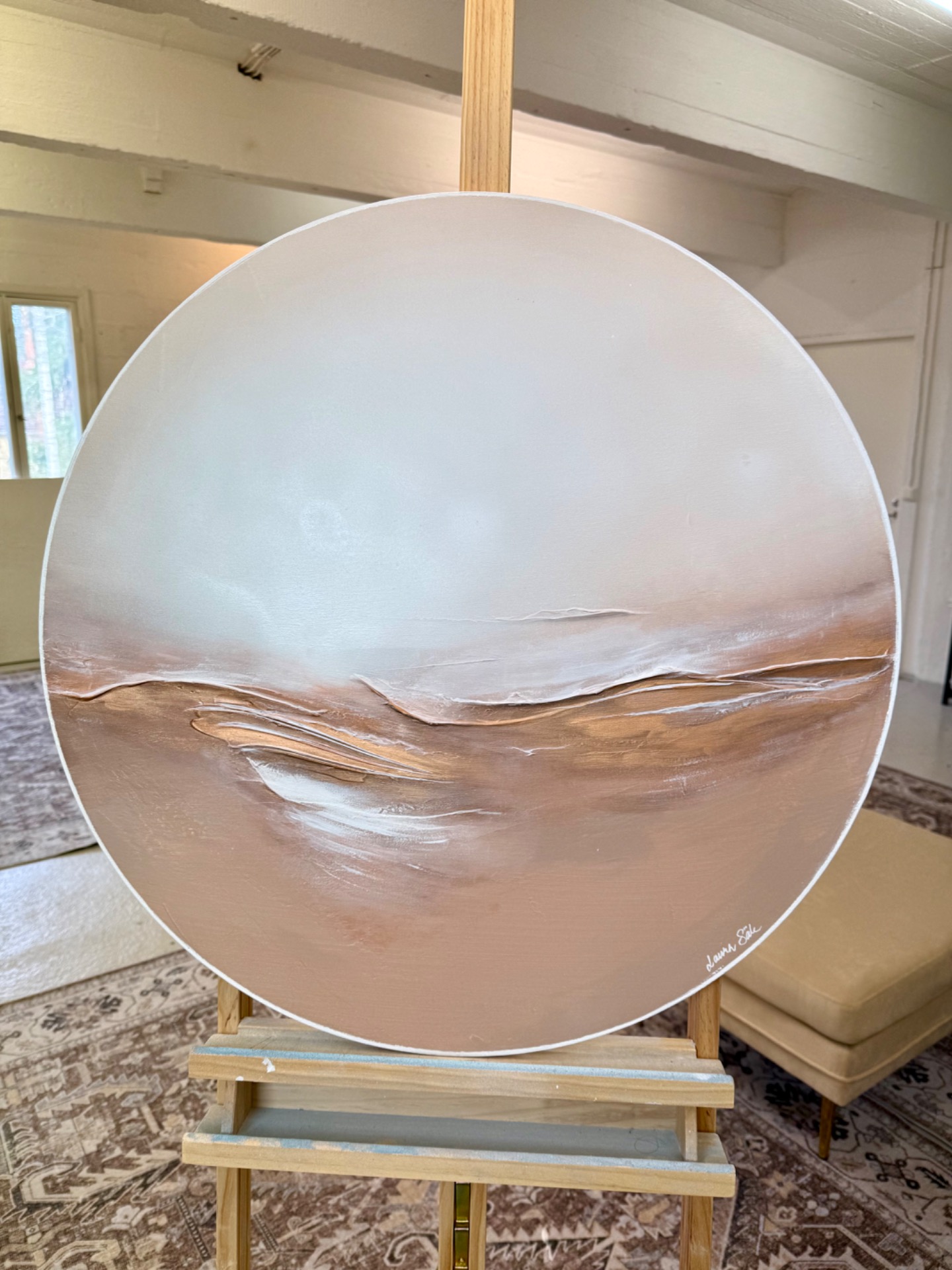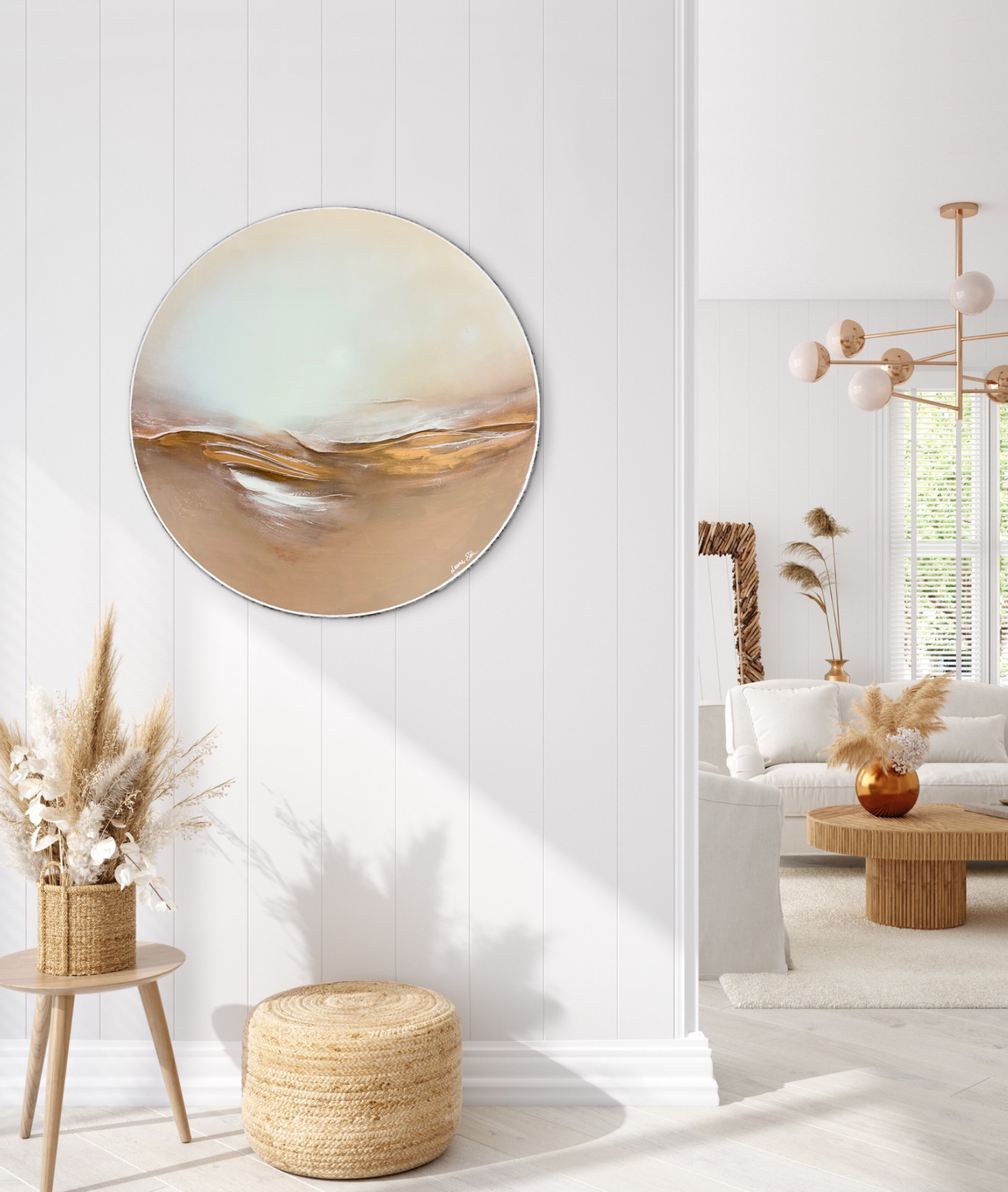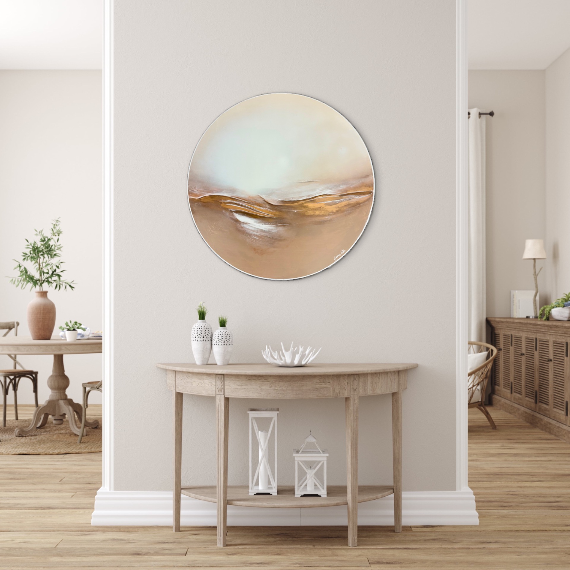 Moderni pyöreä taivaanrantamaalaus, jonka halkaisija on 76 cm.