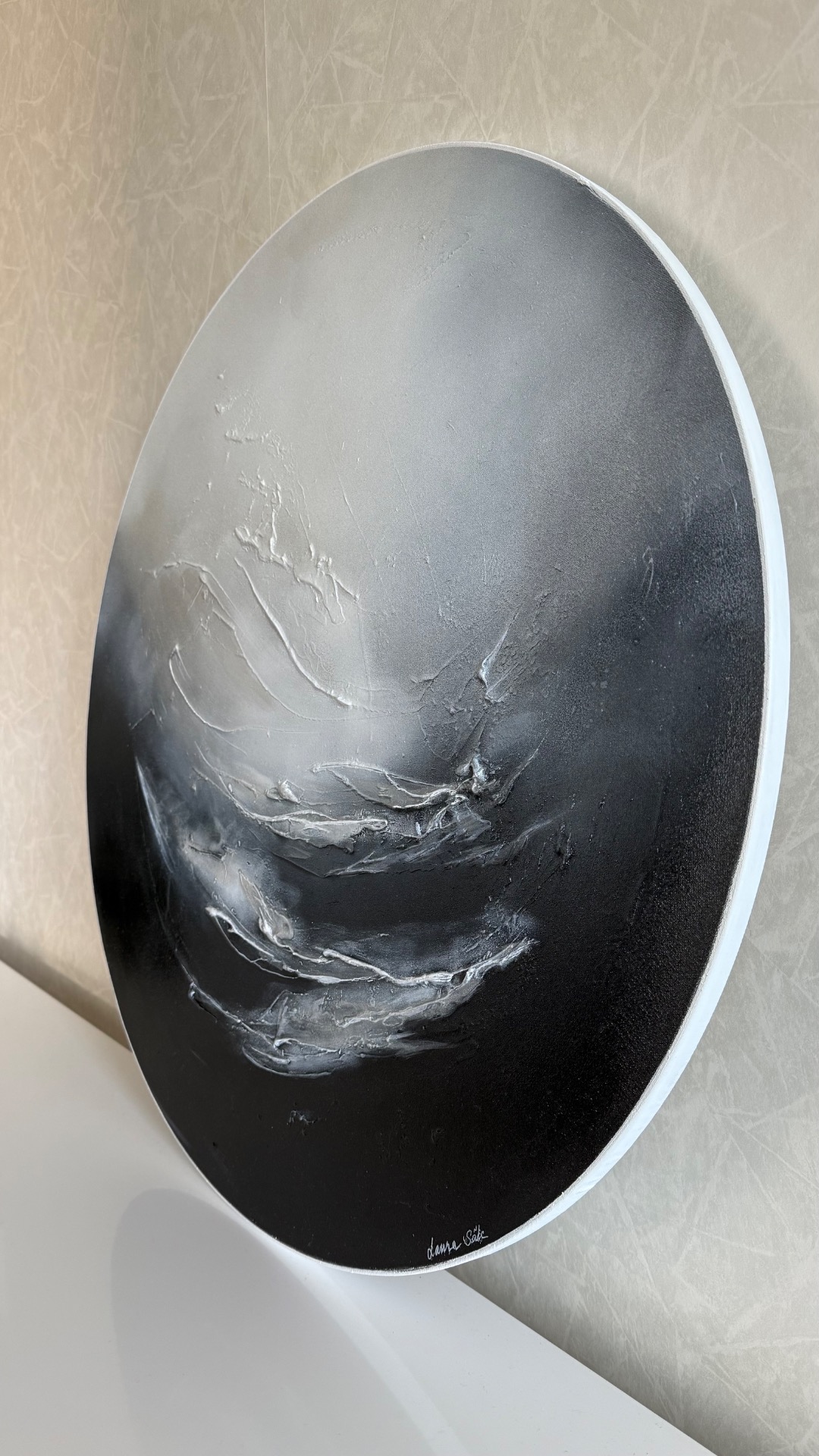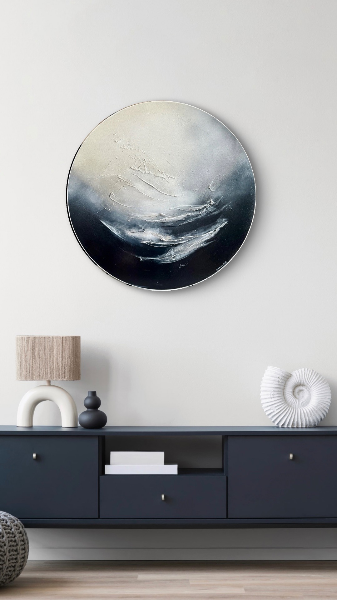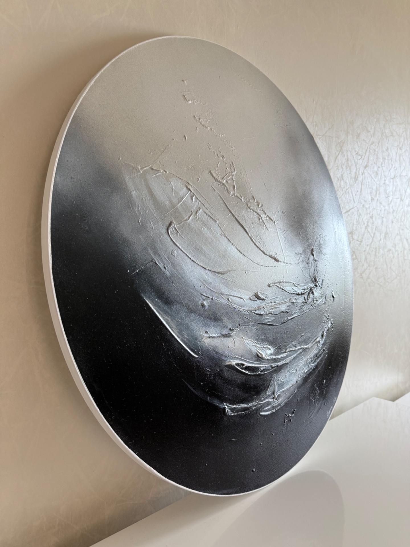 Moderni, pyöreä taivaanrantamaalus suurehkossa keskikoossa (halk. 76 cm).