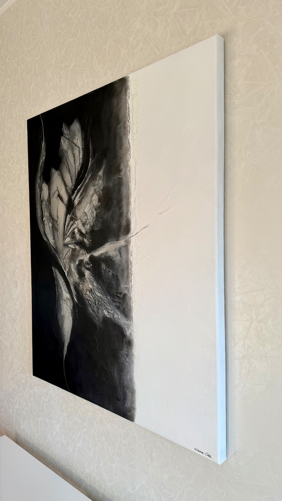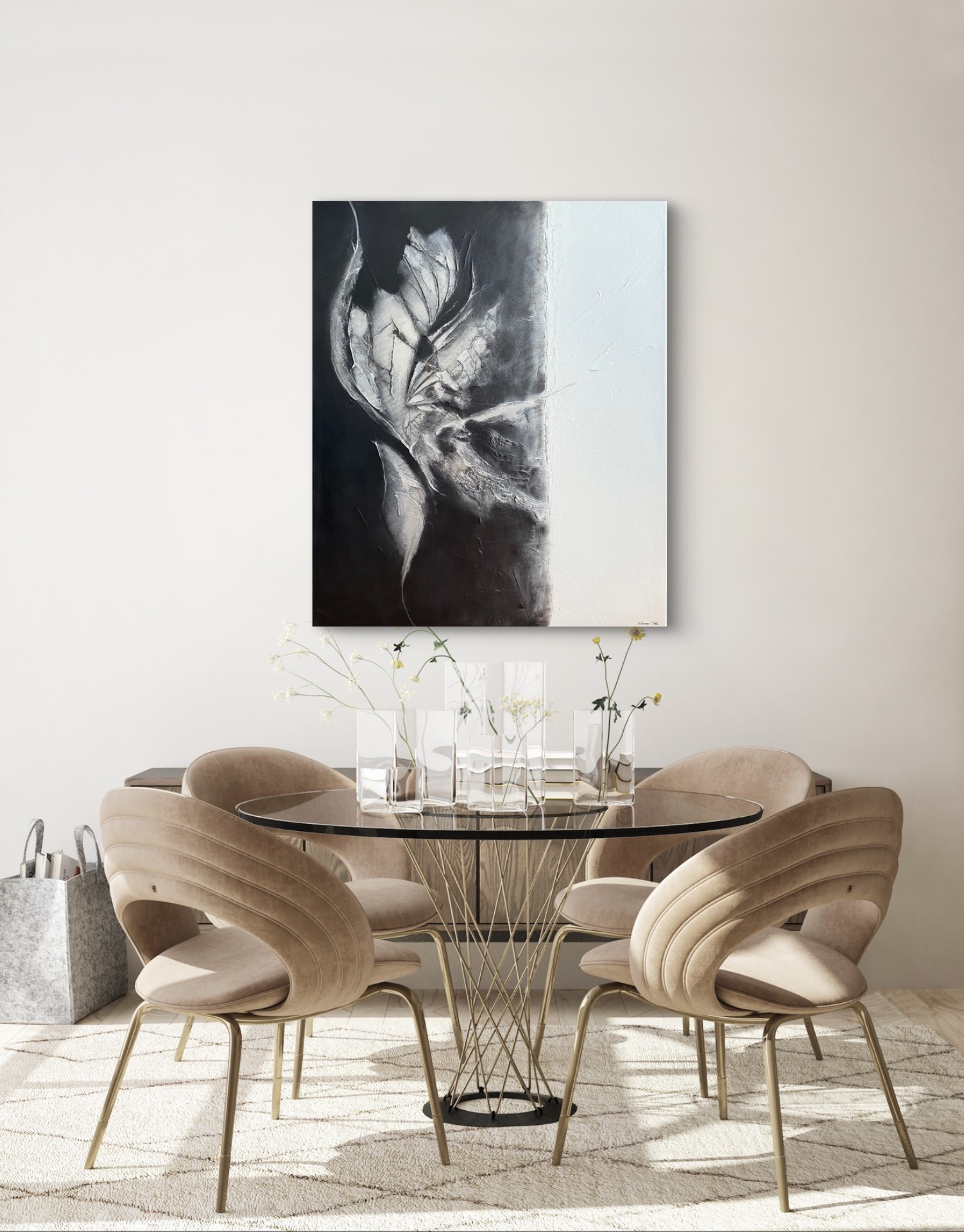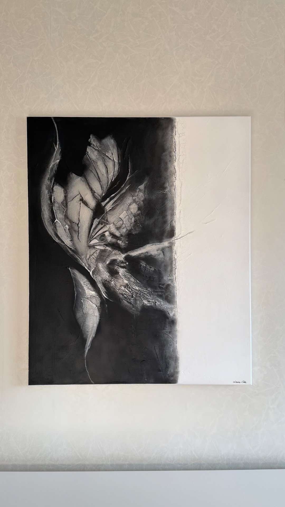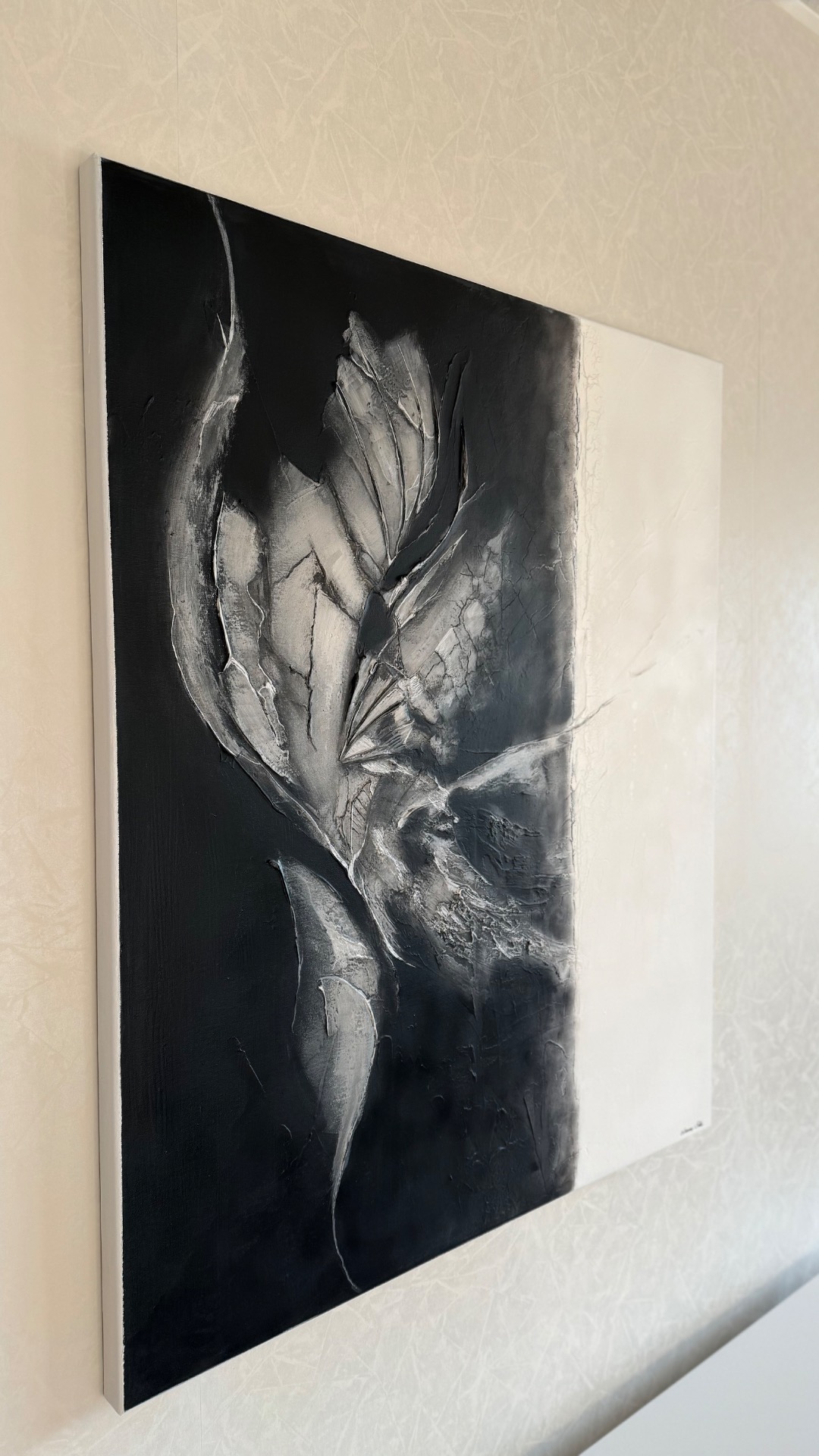 Suurikokoinen mustavalkoinen teos koristeellisella hopeisella kuviolla. Strukturoitu pohja, syvät 3,5 cm reunat.